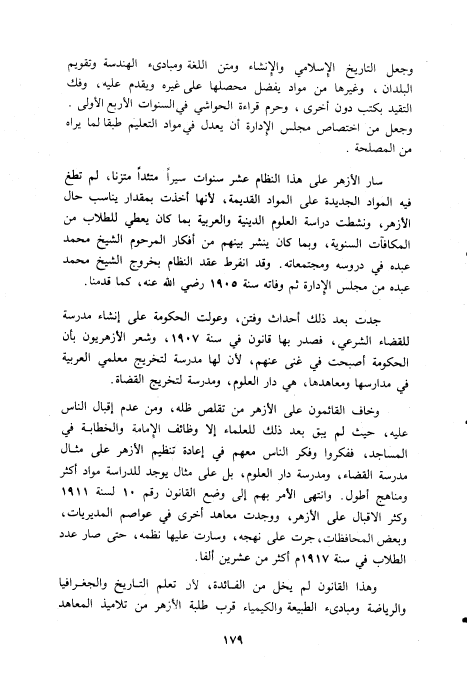 سار الأزهر على هذا النظام عشر سنوات سيرا متئدا متزنا، لم تطغ فيه المواد الجديدة على المواد القديمة، لأنها أخذت بمقدار يناسب حال الأزهر، ونشطت دراسة العلوم الدينية والعربية بما كان يعطي للطلاب من المكافآت السنوية، وبما كان ينشر بينهم من أفكار المرحوم الشيخ محمد عبده في دروسه ومجتمعاته. وقد انفرط عقد النظام بخروج الشيخ محمد عبده من مجلس الإدارة ثم وفاته سنة 1905 رضي اللّه عنه، كما قدمنا.