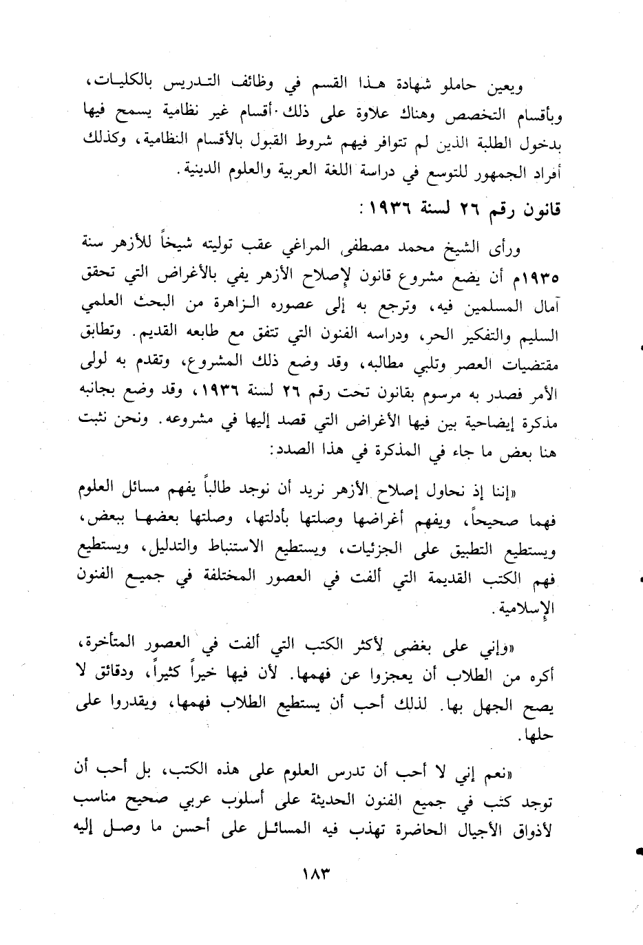 ورأى الشيخ محمد مصطفى المراغي عقب توليته شيخا للأزهر سنة 1935 م أن يضع مشروع قانون لإصلاح الأزهر يفي بالأغراض التي تحقق آمال المسلمين فيه، وترجع به إلى عصوره الزاهرة من البحث العلمي السليم والتفكير الحر، ودراسه الفنون التي تتفق مع طابعه القديم. وتطابق مقتضيات العصر وتلبي مطالبه، وقد وضع ذلك المشروع، وتقدم به لولى الأمر فصدر به مرسوم بقانون تحت رقم 26 لسنة 1936، وقد وضع بجانبه مذكرة إيضاحية بين فيها الأغراض التي قصد إليها في مشروعه. ونحن نثبت هنا بعض ما جاء في المذكرة في هذا الصدد: