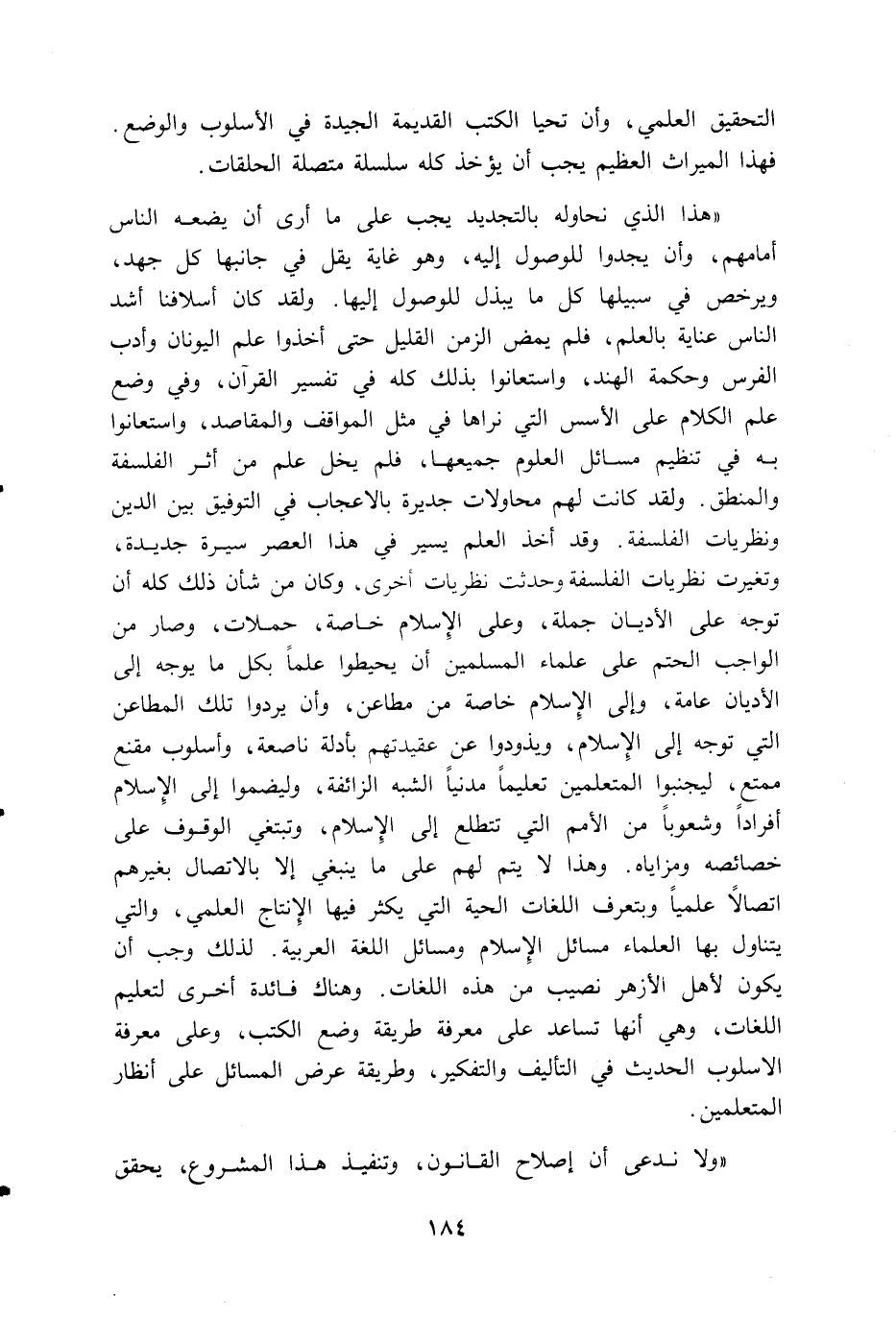 «هذا الذي نحاوله بالتجديد يجب على ما أرى أن يضعه الناس أمامهم، وأن يجدوا للوصول إليه، وهو غاية يقل في جانبها كل جهد، ويرخص في سبيلها كل ما يبذل للوصول إليها. ولقد كان أسلافنا أشد الناس عناية بالعلم، فلم يمض الزمن القليل حتى أخذوا علم اليونان وأدب الفرس وحكمة الهند، واستعانوا بذلك كله في تفسير القرآن، وفي وضع علم الكلام على الأسس التي نراها في مثل المواقف والمقاصد، واستعانوا به في تنظيم مسائل العلوم جميعها، فلم يخل علم من أثر الفلسفة والمنطق. ولقد كانت لهم محاولات جديرة بالاعجاب في التوفيق بين الدين ونظريات الفلسفة. وقد أخذ العلم يسير في هذا العصر سيرة جديدة، وتغيرت نظريات الفلسفة وحدثت نظريات أخرى، وكان من شأن ذلك كله أن توجه على الأديان جملة، وعلى الإسلام خاصة، حملات، وصار من الواجب الحتم على علماء المسلمين أن يحيطوا علما بكل ما يوجه إلى الأديان عامة، وإلى الإسلام خاصة من مطاعن، وأن يردوا تلك المطاعن التي توجه إلى الإسلام، ويذودوا عن عقيدتهم بأدلة ناصعة، وأسلوب مقنع ممتع، ليجنبوا المتعلمين تعليما مدنيا الشبه الزائفة، وليضموا إلى الإسلام أفرادا وشعوبا من الأمم التي تتطلع إلى الإسلام، وتبتغي الوقوف على خصائصه ومزاياه. وهذا لا يتم لهم على ما ينبغي إلا بالاتصال بغيرهم اتصالا علميا وبتعرف اللغات الحية التي يكثر فيها الإنتاج العلمي، والتي يتناول بها العلماء مسائل الإسلام ومسائل اللغة العربية. لذلك وجب أن يكون لأهل الأزهر نصيب من هذه اللغات. وهناك فائدة أخرى لتعليم اللغات، وهي أنها تساعد على معرفة طريقة وضع الكتب، وعلى معرفة الاسلوب الحديث في التأليف والتفكير، وطريقة عرض المسائل على أنظار المتعلمين.