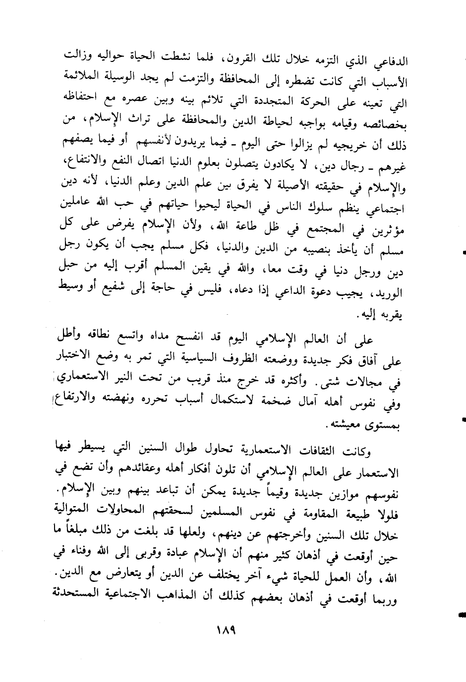على أن العالم الإسلامي اليوم قد انفسح مداه واتسع نطاقه وأطل على آفاق فكر جديدة ووضعته الظروف السياسية التي تمر به وضع الاختبار في مجالات شتى. وأكثره قد خرج منذ قريب من تحت النير الاستعماري وفي نفوس أهله آمال ضخمة لاستكمال أسباب تحرره ونهضته والارتفاع بمستوى معيشته.