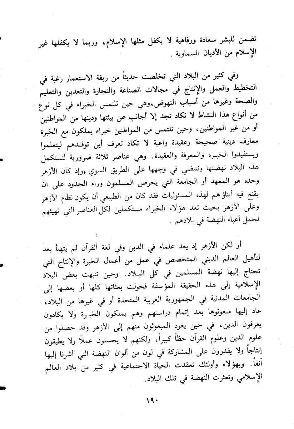 أو لكن الأزهر إذ يعد علماء في الدين وفي لغة القرآن لم يتهيأ بعد لتأهيل العالم الديني المتخصص في عمل من أعمال الخبرة والإنتاج التي تحتاج إليها نهضة المسلمين في كل البلاد. وحين تنبهت بعض البلاد الإسلامية إلى هذه الحقيقة المؤسفة فحولت بعثاتها كلها أو بعضها إلى الجامعات المدنية في الجمهورية العربية المتحدة أو في غيرها من البلاد، عاد إليها مبعوثوها بعد إتمام دراستهم وهم يملكون الخبرة ولا يكادون يعرفون الدين، في حين يعود المبعوثون منهم إلى الأزهر وقد حصلوا من علوم الدين وعلوم القرآن حظا كبيرا، ولكنهم لا يحسنون عملا ولا يطيقون إنتاجا ولا يقدرون على المشاركة في لون من ألوان النهضة التي أشرنا إليها آنفا. وبهؤلاء وأولئك تعقدت الحياة الاجتماعية في كثير من بلاد العالم الإسلامي وتعثرت النهضة في تلك البلاد.