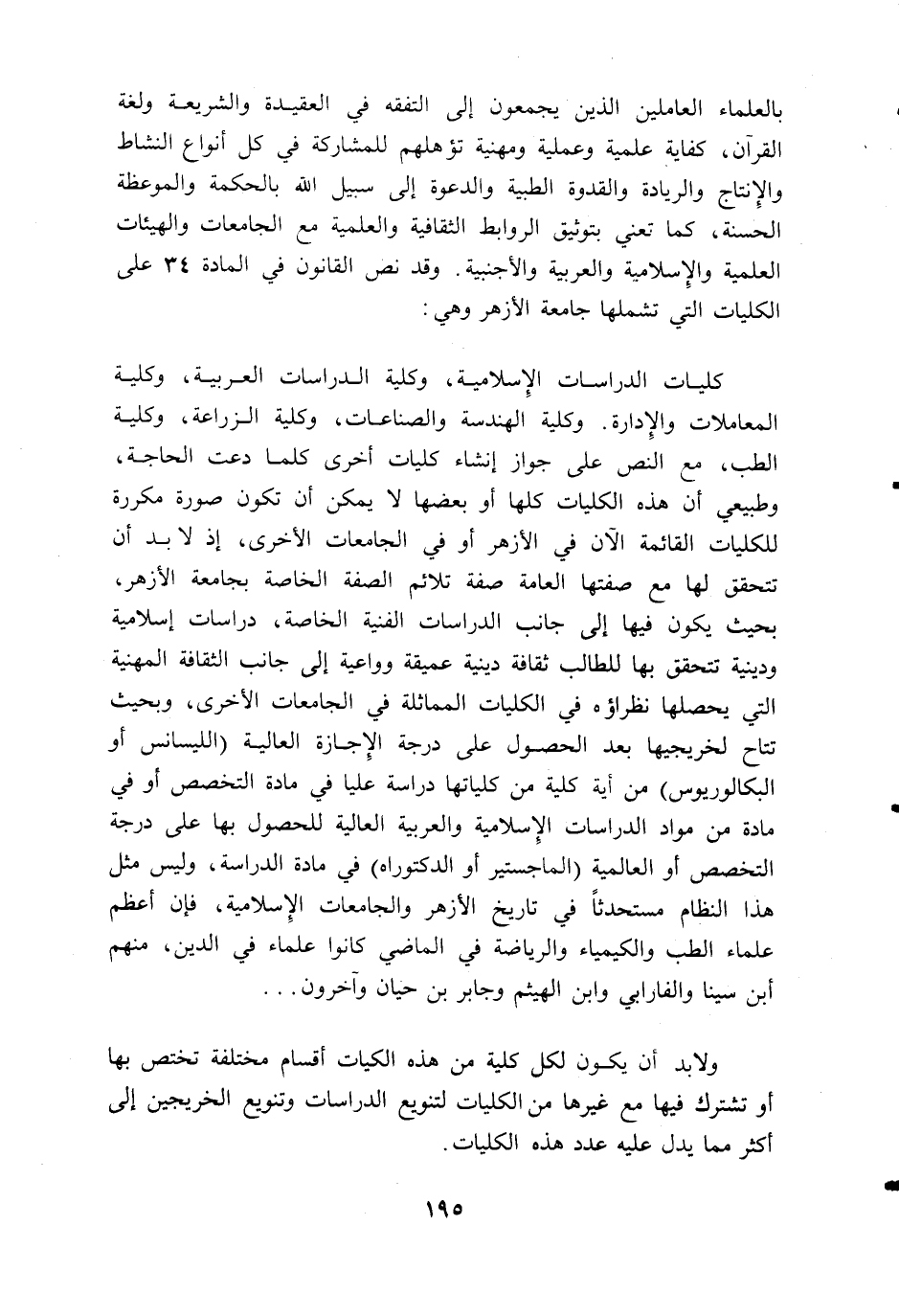 كليات الدراسات الإسلامية، وكلية الدراسات العربية، وكلية المعاملات والإدارة. وكلية الهندسة والصناعات، وكلية الزراعة، وكلية الطب، مع النص على جواز إنشاء كليات أخرى كلما دعت الحاجة، وطبيعي أن هذه الكليات كلها أو بعضها لا يمكن أن تكون صورة مكررة للكليات القائمة الآن في الأزهر أو في الجامعات الأخرى، إذ لا بد أن تتحقق لها مع صفتها العامة صفة تلائم الصفة الخاصة بجامعة الأزهر، بحيث يكون فيها إلى جانب الدراسات الفنية الخاصة، دراسات إسلامية ودينية تتحقق بها للطالب ثقافة دينية عميقة وواعية إلى جانب الثقافة المهنية التي يحصلها نظراؤه في الكليات المماثلة في الجامعات الأخرى، وبحيث تتاح لخريجيها بعد الحصول على درجة الإجازة العالية (الليسانس أو البكالوريوس) من أية كلية من كلياتها دراسة عليا في مادة التخصص أو في مادة من مواد الدراسات الإسلامية والعربية العالية للحصول بها على درجة التخصص أو العالمية (الماجستير أو الدكتوراه) في مادة الدراسة، وليس مثل هذا النظام مستحدثا في تاريخ الأزهر والجامعات الإسلامية، فإن أعظم علماء الطب والكيمياء والرياضة في الماضي كانوا علماء في الدين، منهم أبن سينا والفارابي وابن الهيثم وجابر بن حيان وآخرون. . .