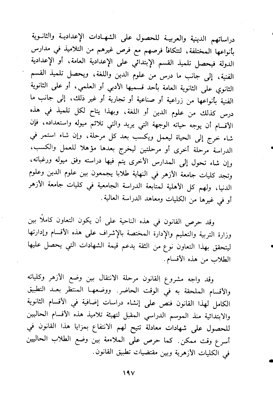 دراساتهم الدينية والعربية للحصول على الشهادات الإعدادية والثانوية بأنواعها المختلفة، لتتكافأ فرصهم مع فرص غيرهم من التلاميذ في مدارس الدولة فيحصل تلميذ القسم الإبتدائي على الإعدادية العامة، أو الإعدادية الفنية، إلى جانب ما درس من علوم الدين واللغة، ويحصل تلميذ القسم الثانوي على الثانوية العامة بأحد قسميها الأدبي أو العلمي، أو على الثانوية الفنية بأنواعها من زراعية أو صناعية أو تجارية أو غير ذلك، إلى جانب ما درس كذلك من علوم الدين أو اللغة، وبهذا يتاح لكل تلميذ في هذه الأقسام أن يوجه حياته الوجهة التي يريد والتي تلائم ميوله واستعداده، فإن شاء خرج إلى الحياة ليعمل ويكسب بعد كل مرحلة، وإن شاء استمر في الدراسة مرحلة أخرى أو مرحلتين ليخرج بعدها مؤهلا للعمل والكسب، وإن شاء تحول إلى المدارس الأخرى يتم فيها دراسته وفق ميوله ورغباته، وتجد كليات جامعة الأزهر في النهاية طلابا يجمعون بين علوم الدين وعلوم الدنيا، ولهم كل الأهلية لمتابعة الدراسة الجامعية في كليات جامعة الأزهر أو في غيرها من الكليات ومعاهد الدراسة العالية.
