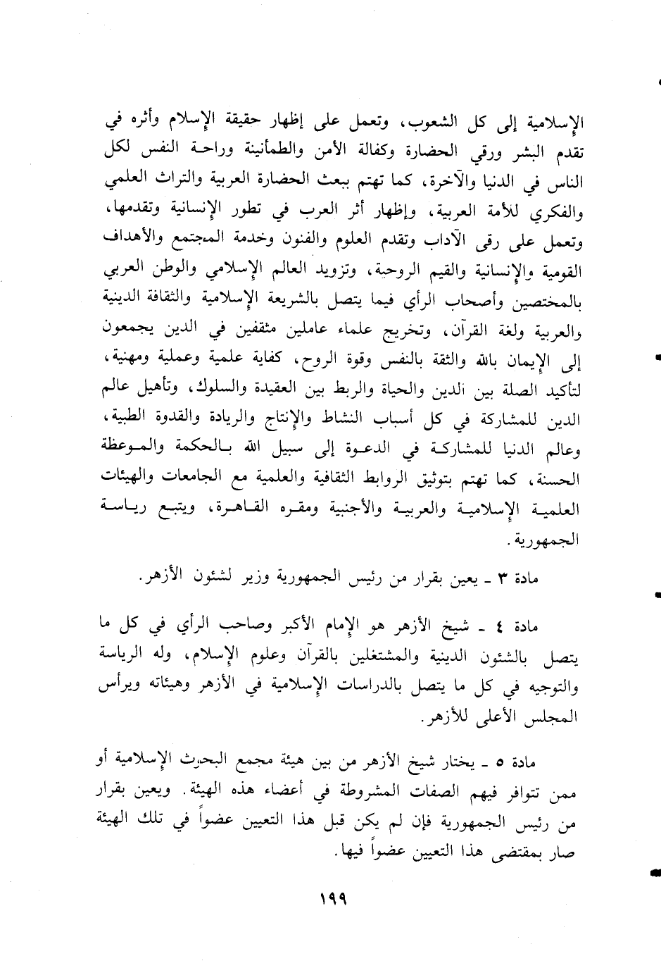 مادة 5 - يختار شيخ الأزهر من بين هيئة مجمع البحوث الإسلامية أو ممن تتوافر فيهم الصفات المشروطة في أعضاء هذه الهيئة. ويعين بقرار من رئيس الجمهورية فإن لم يكن قبل هذا التعيين عضوا في تلك الهيئة صار بمقتضى هذا التعيين عضوا فيها.