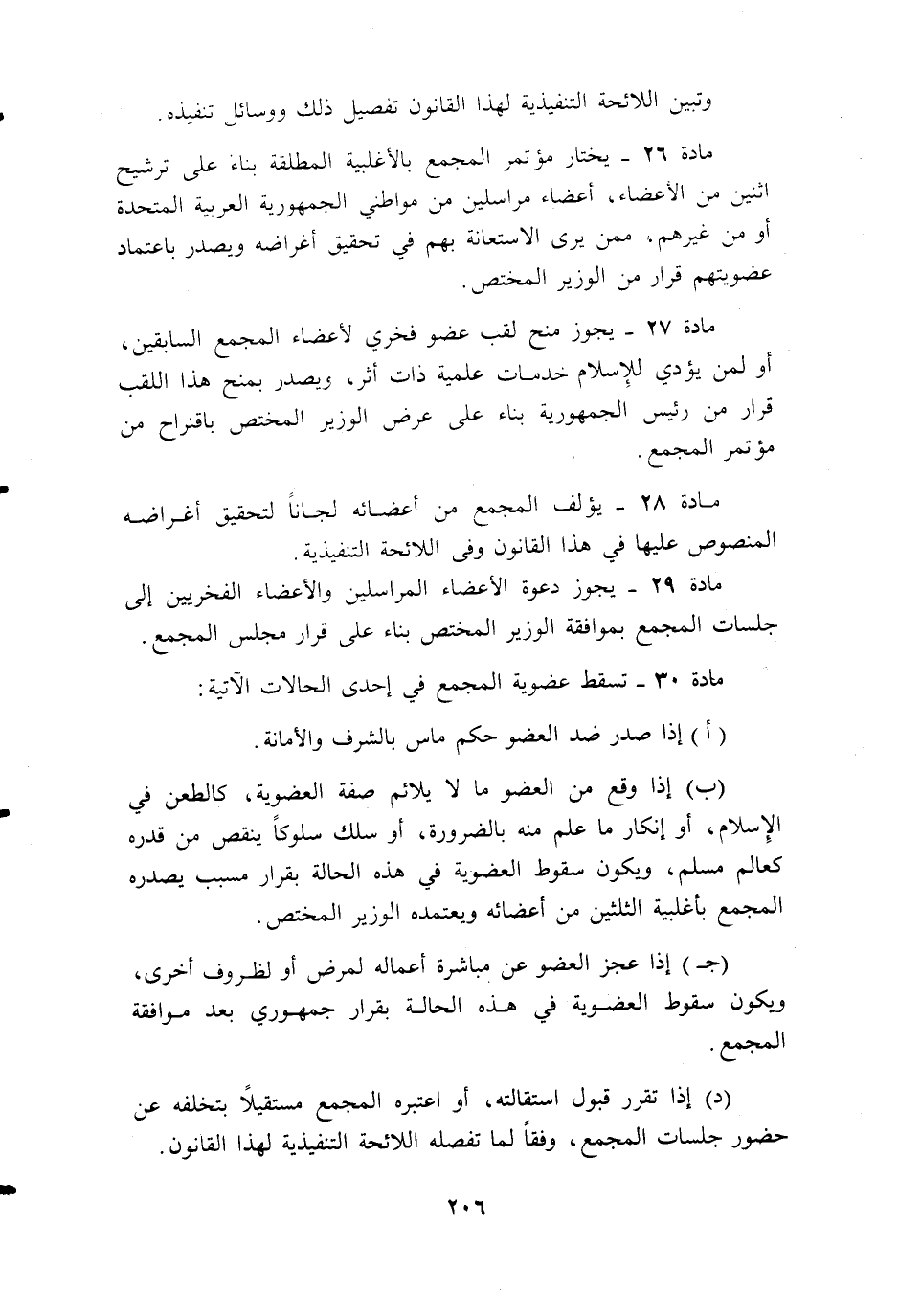 (ب) إذا وقع من العضو ما لا يلائم صفة العضوية، كالطعن في الإسلام، أو إنكار ما علم منه بالضرورة، أو سلك سلوكا ينقص من قدره كعالم مسلم، ويكون سقوط العضوية في هذه الحالة بقرار مسبب يصدره المجمع بأغلبية الثلثين من أعضائه ويعتمده الوزير المختص.