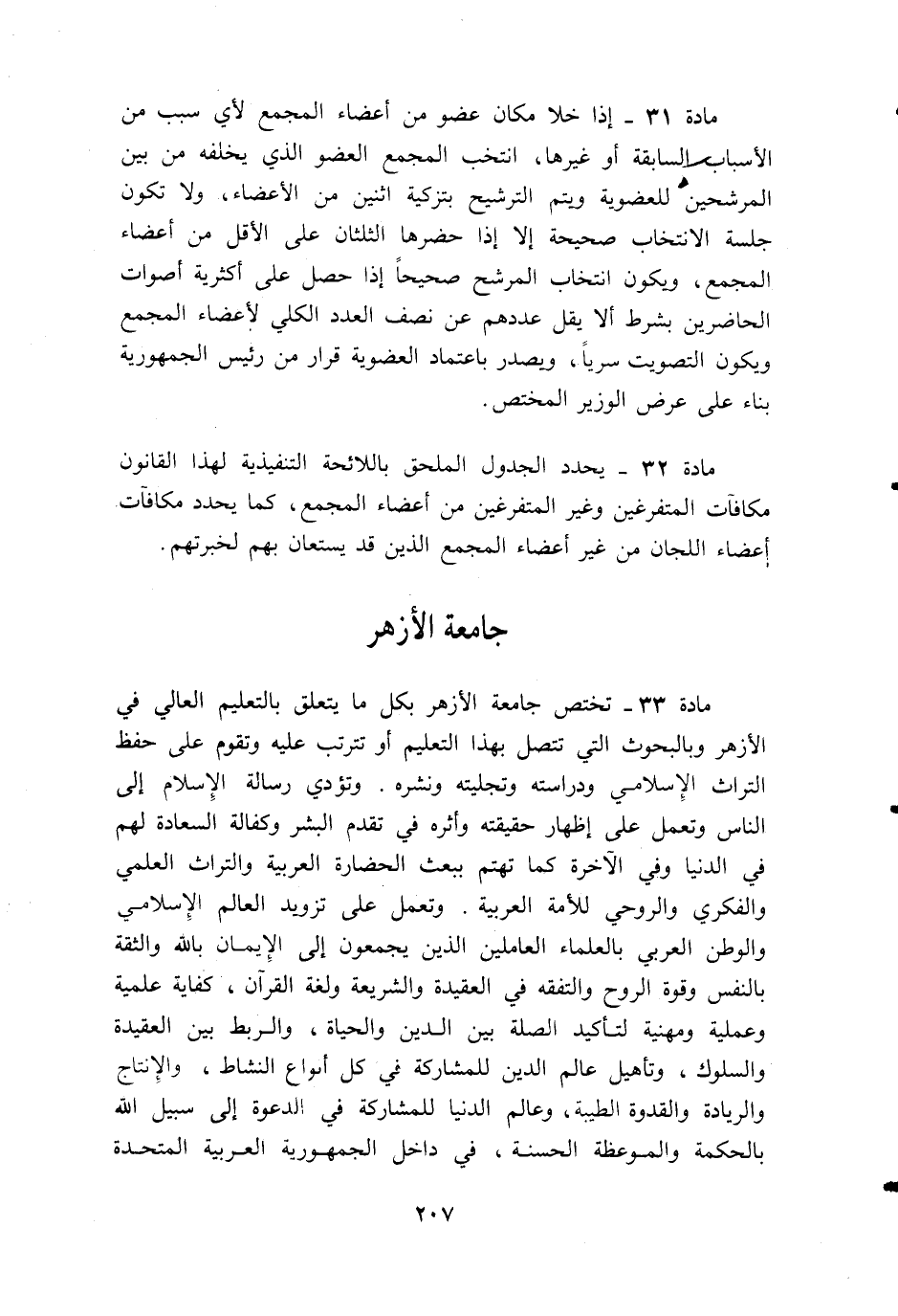 مادة 33 - تختص جامعة الأزهر بكل ما يتعلق بالتعليم العالي في الأزهر وبالبحوث التي تتصل بهذا التعليم أو تترتب عليه وتقوم على حفظ التراث الإسلامي ودراسته وتجليته ونشره. وتؤدي رسالة الإسلام إلى الناس وتعمل على إظهار حقيقته وأثره في تقدم البشر وكفالة السعادة لهم في الدنيا وفي الآخرة كما تهتم ببعث الحضارة العربية والتراث العلمي والفكري والروحي للأمة العربية. وتعمل على تزويد العالم الإسلامي والوطن العربي بالعلماء العاملين الذين يجمعون إلى الإيمان باللّه والثقة بالنفس وقوة الروح والتفقه في العقيدة والشريعة ولغة القرآن، كفاية علمية وعملية ومهنية لتأكيد الصلة بين الدين والحياة، والربط بين العقيدة والسلوك، وتأهيل عالم الدين للمشاركة في كل أنواع النشاط، والإنتاج والريادة والقدوة الطيبة، وعالم الدنيا للمشاركة في الدعوة إلى سبيل اللّه بالحكمة والموعظة الحسنة، في داخل الجمهورية العربية المتحدة