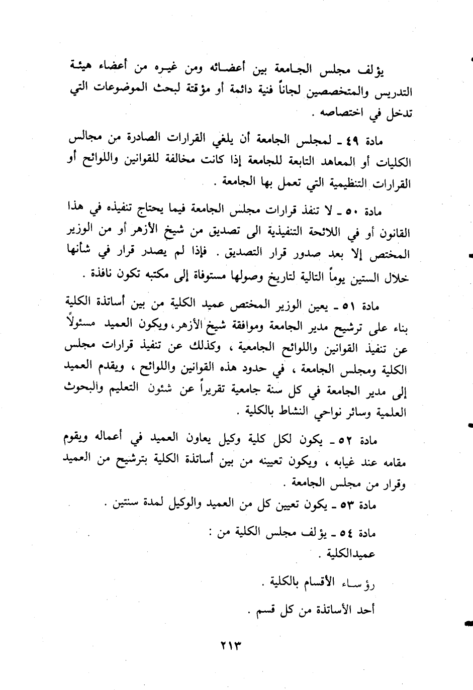 مادة 51 - يعين الوزير المختص عميد الكلية من بين أساتذة الكلية بناء على ترشيح مدير الجامعة وموافقة شيخ الأزهر، ويكون العميد مسئولا عن تنفيذ القوانين واللوائح الجامعية، وكذلك عن تنفيذ قرارات مجلس الكلية ومجلس الجامعة، في حدود هذه القوانين واللوائح، ويقدم العميد إلى مدير الجامعة في كل سنة جامعية تقريرا عن شئون التعليم والبحوث العلمية وسائر نواحي النشاط بالكلية.