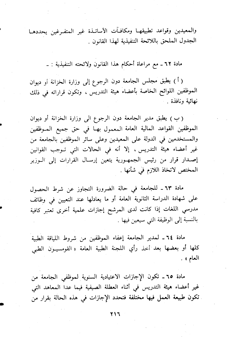 مادة 63 - للجامعة في حالة الضرورة التجاوز عن شرط الحصول على شهادة الدراسة الثانوية العامة أو ما يعادلها عند التعيين في وظائف مدرسي اللغات إذا كانت لدى المرشح إجازات علمية أخرى تعتبر كافية بالنسبة إلى الوظيفة التي سيعين فيها.