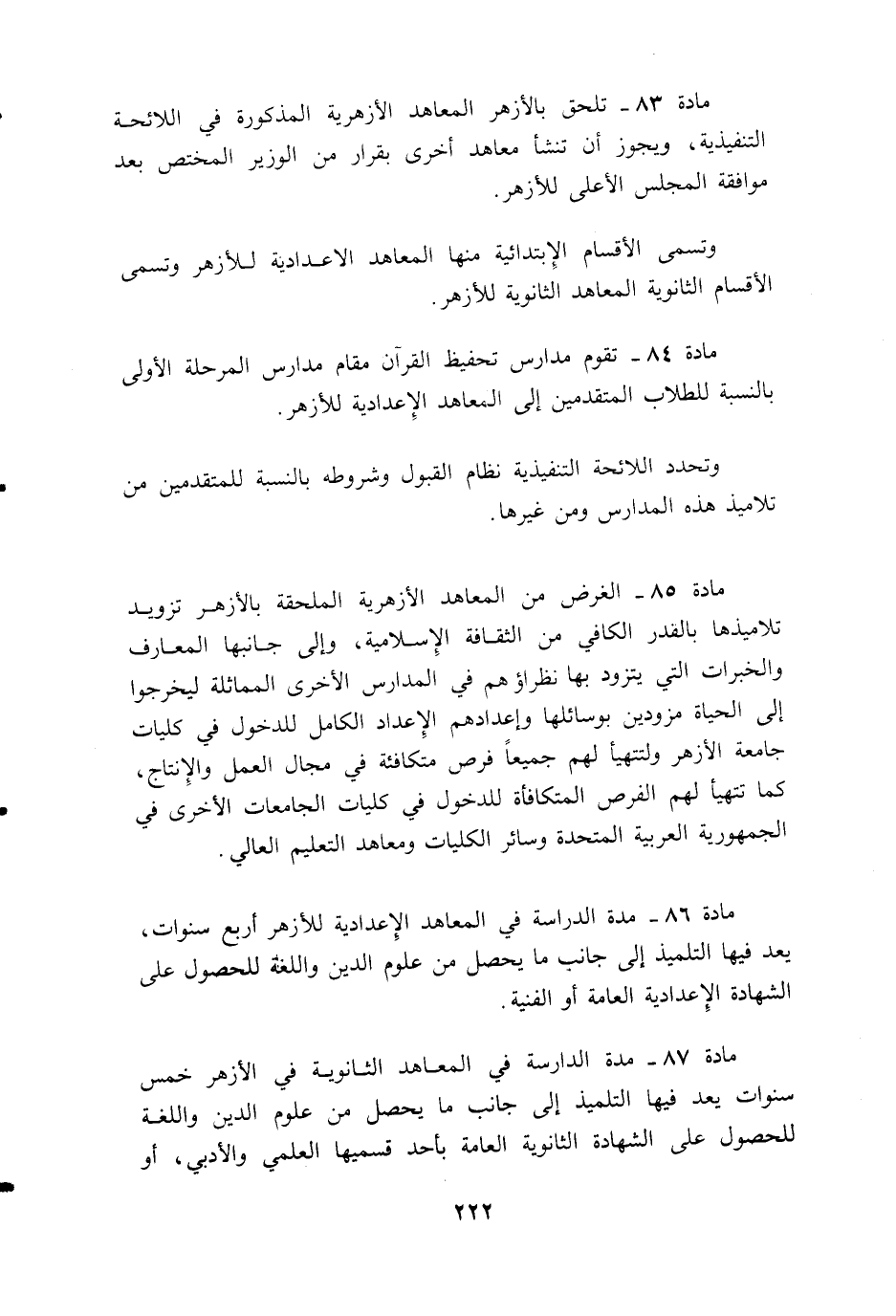مادة 85 - الغرض من المعاهد الأزهرية الملحقة بالأزهر تزويد تلاميذها بالقدر الكافي من الثقافة الإسلامية، وإلى جانبها المعارف والخبرات التي يتزود بها نظراؤهم في المدارس الأخرى المماثلة ليخرجوا إلى الحياة مزودين بوسائلها وإعدادهم الإعداد الكامل للدخول في كليات جامعة الأزهر ولتتهيأ لهم جميعا فرص متكافئة في مجال العمل والإنتاج، كما تتهيأ لهم الفرص المتكافأة للدخول في كليات الجامعات الأخرى في الجمهورية العربية المتحدة وسائر الكليات ومعاهد التعليم العالي.