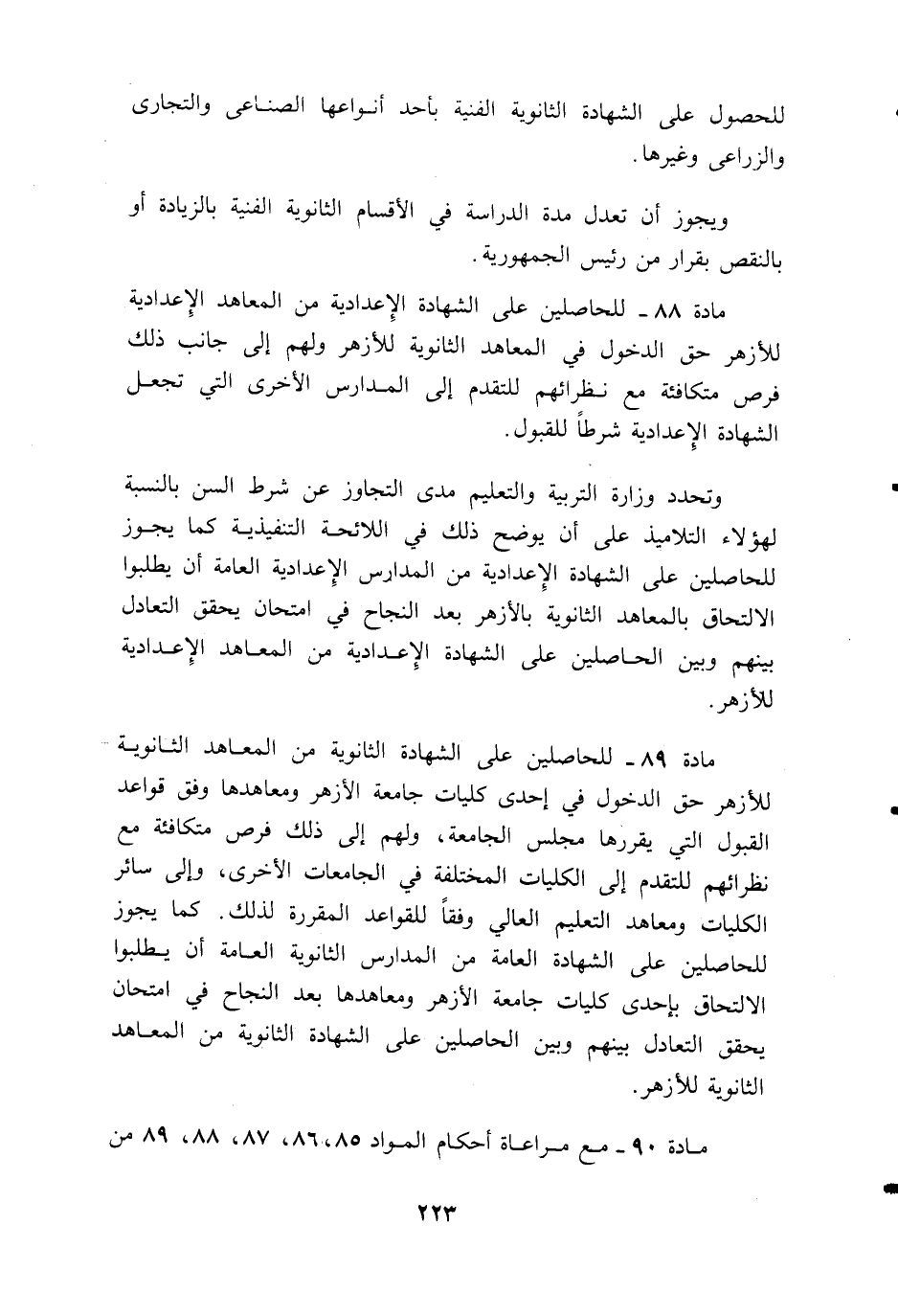 مادة 88 - للحاصلين على الشهادة الإعدادية من المعاهد الإعدادية للأزهر حق الدخول في المعاهد الثانوية للأزهر ولهم إلى جانب ذلك فرص متكافئة مع نظرائهم للتقدم إلى المدارس الأخرى التي تجعل الشهادة الإعدادية شرطا للقبول.