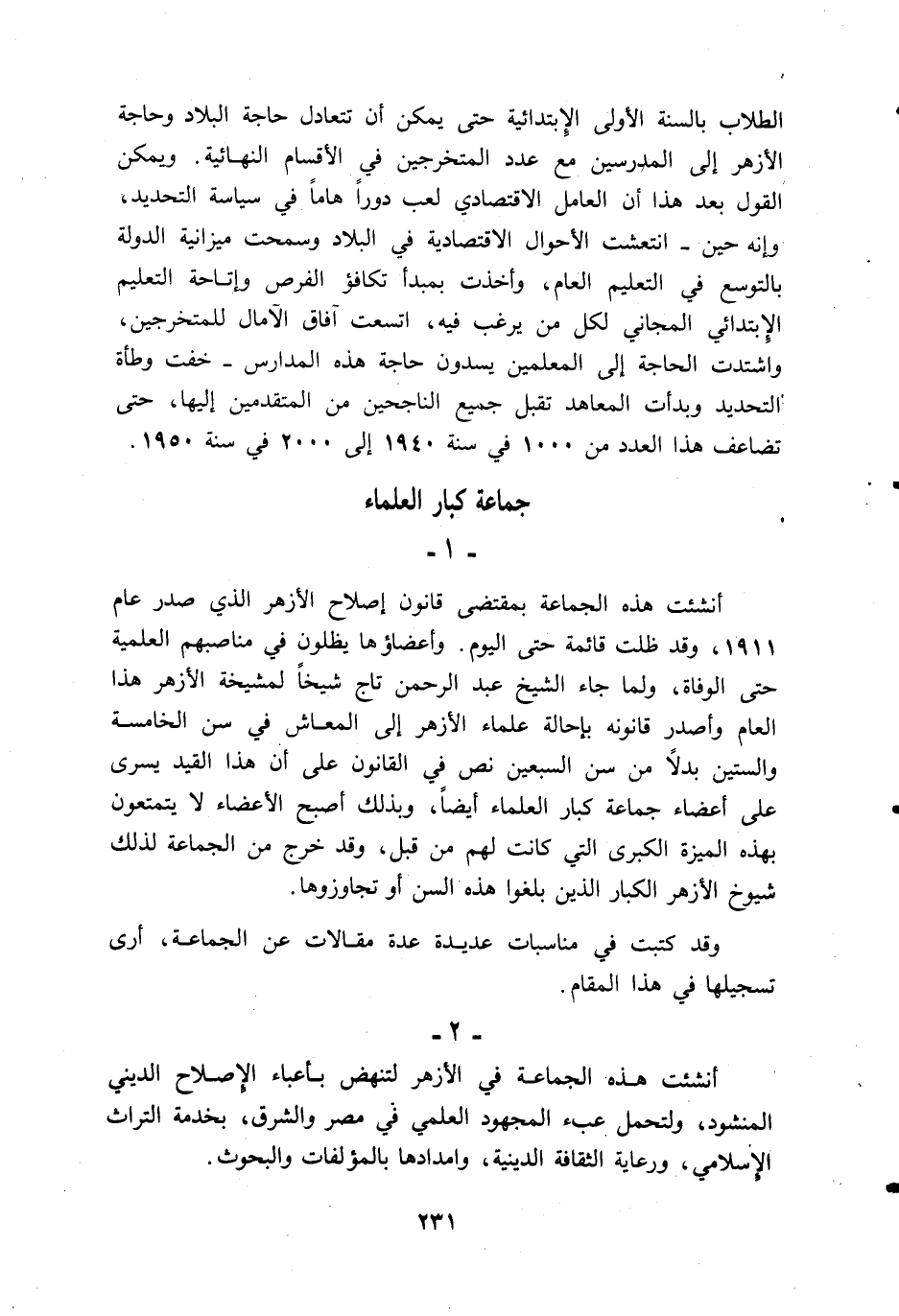 الطلاب بالسنة الأولى الإبتدائية حتى يمكن أن تتعادل حاجة البلاد وحاجة الأزهر إلى المدرسين مع عدد المتخرجين في الأقسام النهائية. ويمكن القول بعد هذا أن العامل الاقتصادي لعب دورا هاما في سياسة التحديد، وإنه حين-انتعشت الأحوال الاقتصادية في البلاد وسمحت ميزانية الدولة بالتوسع في التعليم العام، وأخذت بمبدأ تكافؤ الفرص وإتاحة التعليم الإبتدائي المجاني لكل من يرغب فيه، اتسعت آفاق الآمال للمتخرجين، واشتدت الحاجة إلى المعلمين يسدون حاجة هذه المدارس-خفت وطأة التحديد وبدأت المعاهد تقبل جميع الناجحين من المتقدمين إليها، حتى تضاعف هذا العدد من 1000 في سنة 1940 إلى 2000 في سنة 1950.