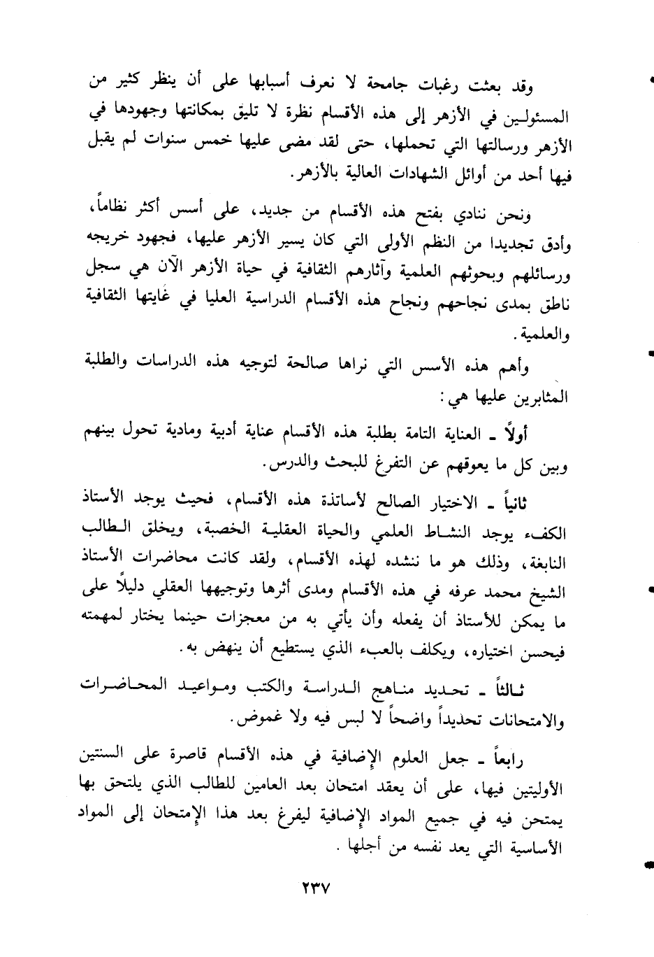 ونحن ننادي بفتح هذه الأقسام من جديد، على أسس أكثر نظاما، وأدق تجديدا من النظم الأولى التي كان يسير الأزهر عليها، فجهود خريجه ورسائلهم وبحوثهم العلمية وآثارهم الثقافية في حياة الأزهر الآن هي سجل ناطق بمدى نجاحهم ونجاح هذه الأقسام الدراسية العليا في غايتها الثقافية والعلمية.