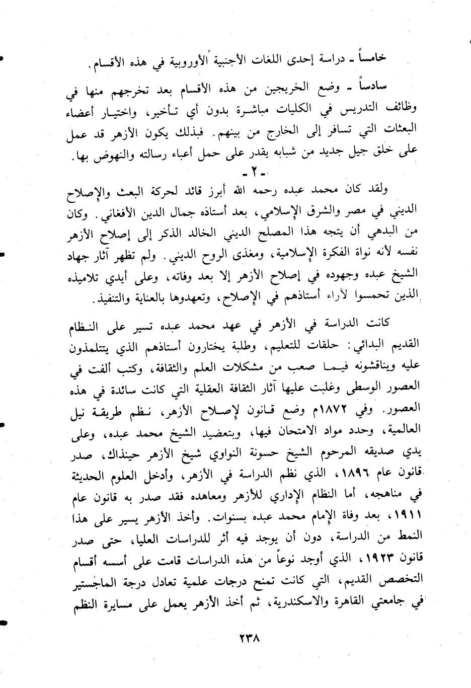 سادسا-وضع الخريجين من هذه الأقسام بعد تخرجهم منها في وظائف التدريس في الكليات مباشرة بدون أي تأخير، واختيار أعضاء البعثات التي تسافر إلى الخارج من بينهم. فبذلك يكون الأزهر قد عمل على خلق جيل جديد من شبابه يقدر على حمل أعباء رسالته والنهوض بها.