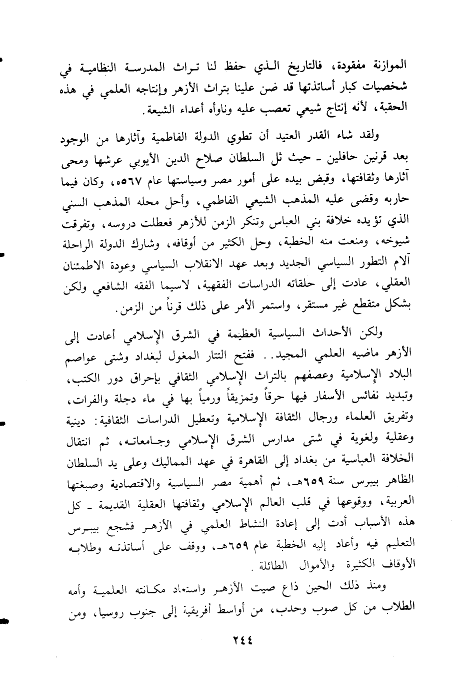 الموازنة مفقودة، فالتاريخ الذي حفظ لنا تراث المدرسة النظامية في شخصيات كبار أساتذتها قد ضن علينا بتراث الأزهر وإنتاجه العلمي في هذه الحقبة، لأنه إنتاج شيعي تعصب عليه وناوأه أعداء الشيعة.