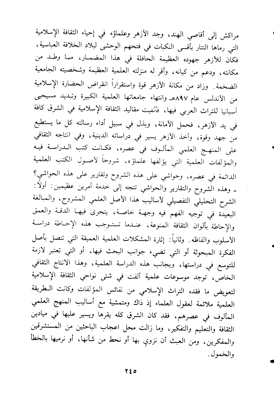 مراكش إلى أقاصي الهند، وجد الأزهر وعلماؤه في إحياء الثقافة الإسلامية التي رماها التتار بأقسى النكبات في فتحهم الوحشى لبلاد الخلافة العباسية، فكان للأزهر جهوده العظيمة الحافلة في هذا المضمار، مما وطد من مكانته، ودعم من كيانه، وأقر له منزلته العلمية العظيمة وشخصيته الجامعية الضخمة. وزاد من مكانة الأزهر قوة واستقرارا انقراض الحضارة الإسلامية من الأندلس عام 897 ه وانتهاء جامعاتها العلمية الكبيرة وتبديد مسيحيى أسبانيا للتراث العربي فيها، فألقيت مقاليد الثقافة الإسلامية في الشرق كافة في يد الأزهر، فحمل الأمانة، وبذل في سبيل أداء رسالته كل ما يستطيع من جهد وقوة، وأخذ الأزهر يسير في دراساته الدينية، وفي انتاجه الثقافي على المنهج العلمي المألوف في عصره، فكانت كتب الدراسة فيه والمؤلفات العلمية التي يؤلفها علماؤه، شروحا لأصول الكتب العلمية الدائمة في عصره، وحواشي على هذه الشروح وتقارير على هذه الحواشي؟ -و هذه الشروح والتقارير والحواشي تتجه إلى خدمة أمرين عظيمين: أولا: