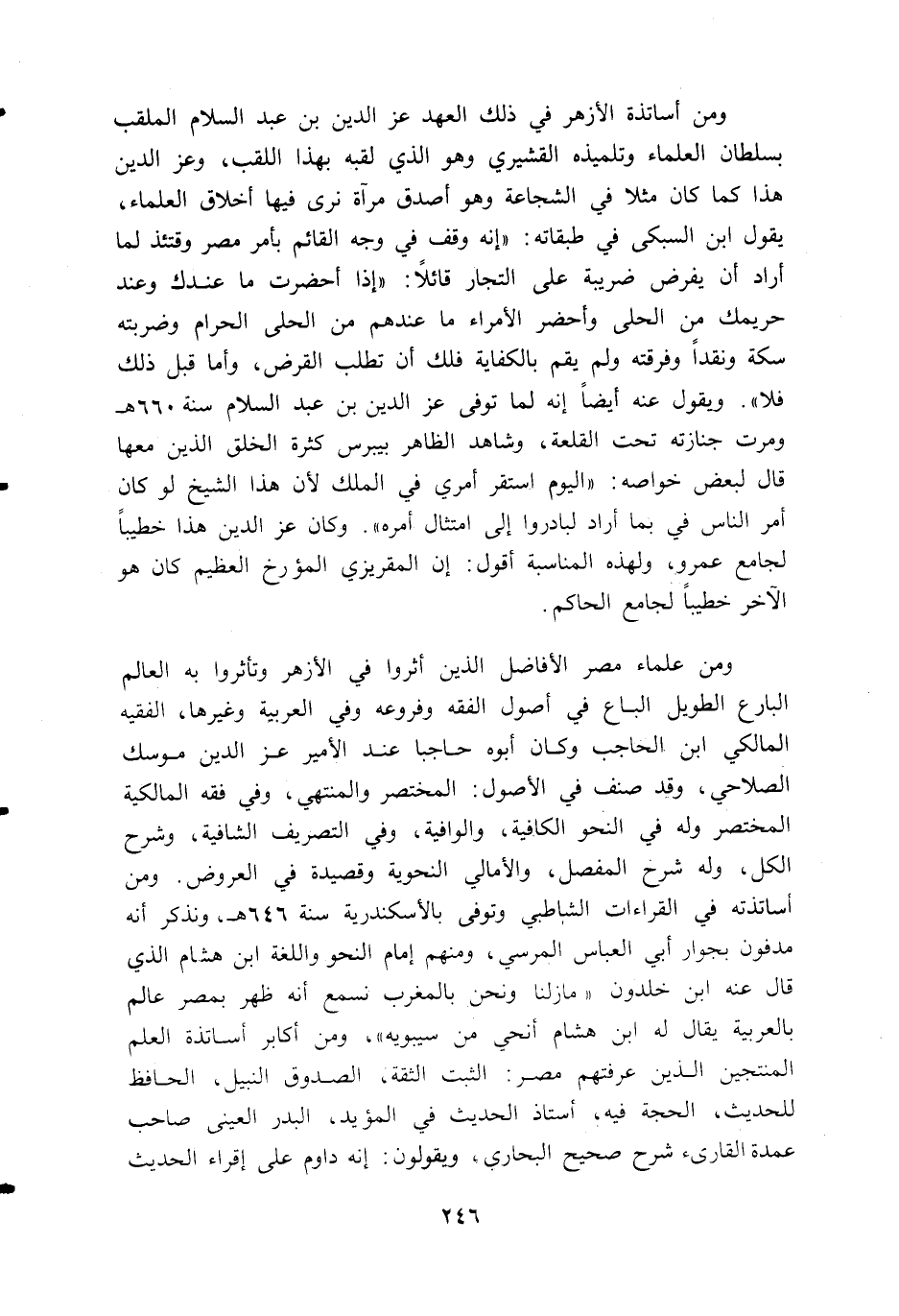 ومن أساتذة الأزهر في ذلك العهد عز الدين بن عبد السلام الملقب بسلطان العلماء وتلميذه القشيري وهو الذي لقبه بهذا اللقب، وعز الدين هذا كما كان مثلا في الشجاعة وهو أصدق مرآة نرى فيها أخلاق العلماء، يقول ابن السبكى في طبقاته: «إنه وقف في وجه القائم بأمر مصر وقتئذ لما أراد أن يفرض ضريبة على التجار قائلا: «إذا أحضرت ما عندك وعند حريمك من الحلى وأحضر الأمراء ما عندهم من الحلى الحرام وضربته سكة ونقدا وفرقته ولم يقم بالكفاية فلك أن تطلب القرض، وأما قبل ذلك فلا». ويقول عنه أيضا إنه لما توفى عز الدين بن عبد السلام سنة 660 ه ومرت جنازته تحت القلعة، وشاهد الظاهر بيبرس كثرة الخلق الذين معها قال لبعض خواصه: «اليوم استقر أمري في الملك لأن هذا الشيخ لو كان أمر الناس في بما أراد لبادروا إلى امتثال أمره». وكان عز الدين هذا خطيبا لجامع عمرو، ولهذه المناسبة أقول: إن المقريزي المؤرخ العظيم كان هو الآخر خطيبا لجامع الحاكم.