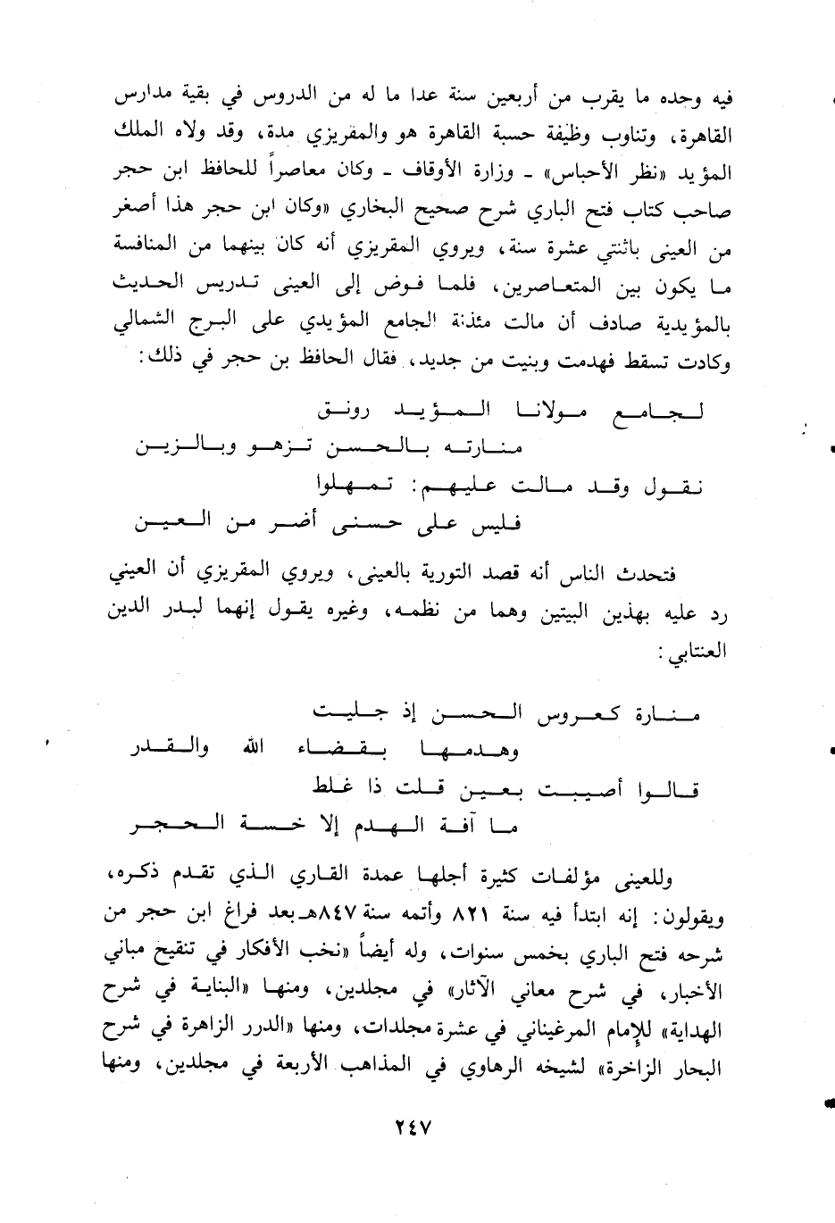 فيه وحده ما يقرب من أربعين سنة عدا ما له من الدروس في بقية مدارس القاهرة، وتناوب وظيفة حسبة القاهرة هو والمقريزي مدة، وقد ولاه الملك المؤيد «نظر الأحباس» -وزارة الأوقاف-و كان معاصرا للحافظ ابن حجر صاحب كتاب فتح الباري شرح صحيح البخاري «و كان ابن حجر هذا أصغر من العينى باثنتي عشرة سنة، ويروي المقريزي أنه كان بينهما من المنافسة ما يكون بين المتعاصرين، فلما فوض إلى العينى تدريس الحديث بالمؤيدية صادف أن مالت مئذنة الجامع المؤيدي على البرج الشمالي وكادت تسقط فهدمت وبنيت من جديد، فقال الحافظ بن حجر في ذلك: