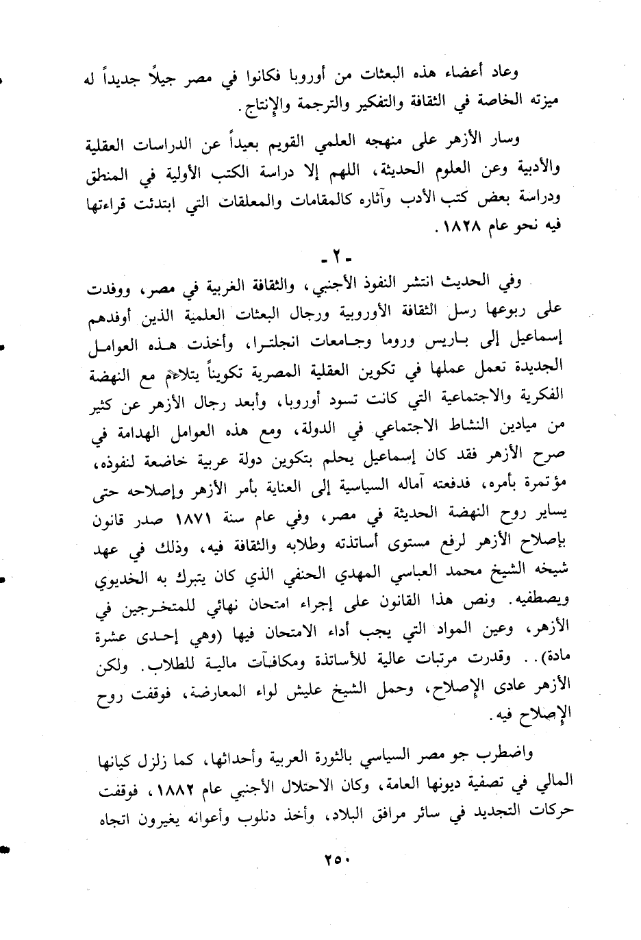 وسار الأزهر على منهجه العلمي القويم بعيدا عن الدراسات العقلية والأدبية وعن العلوم الحديثة، اللهم إلا دراسة الكتب الأولية في المنطق ودراسة بعض كتب الأدب وآثاره كالمقامات والمعلقات التي ابتدئت قراءتها فيه نحو عام 1828.