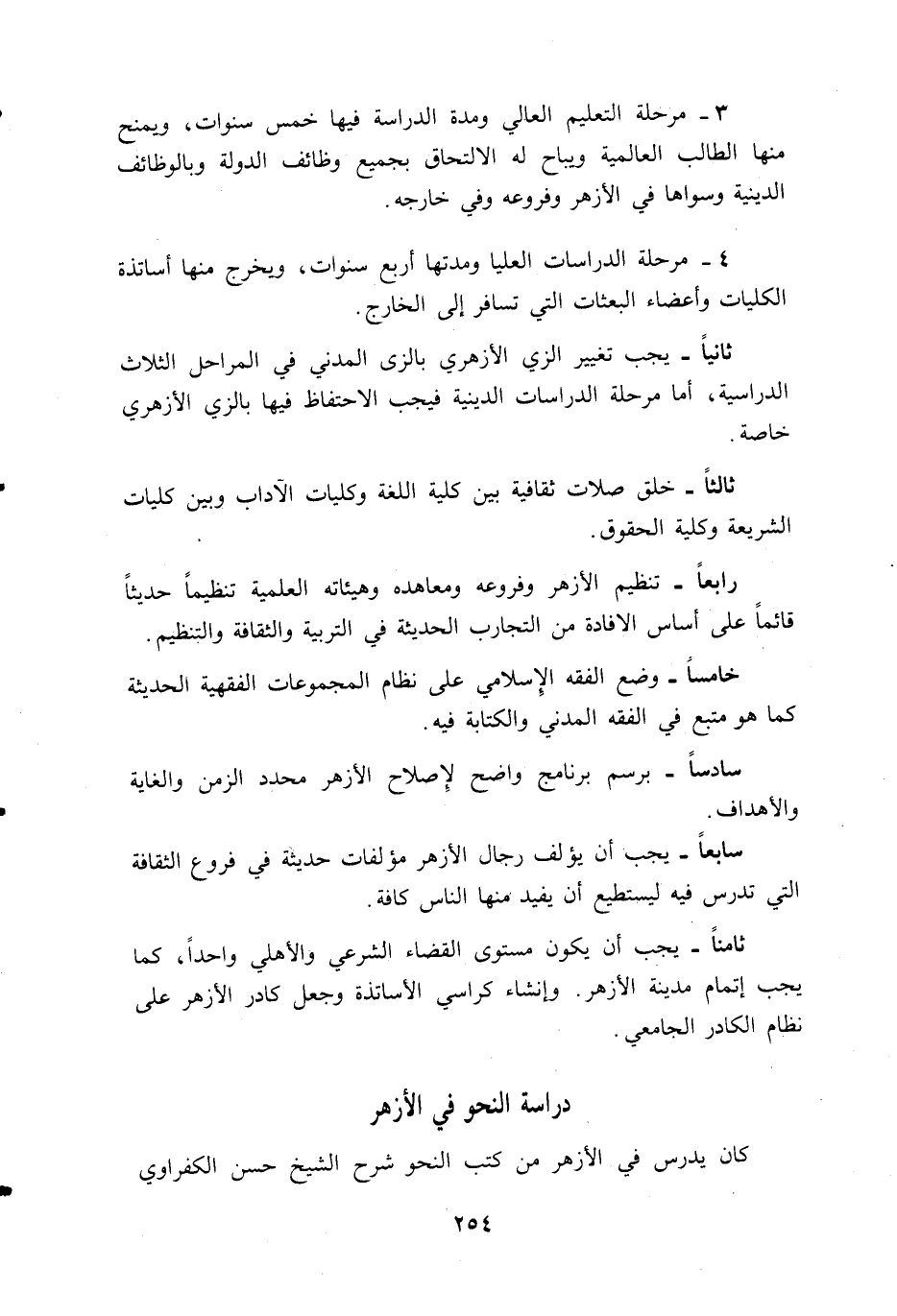 ثامنا-يجب أن يكون مستوى القضاء الشرعي والأهلي واحدا، كما يجب إتمام مدينة الأزهر. وإنشاء كراسي الأساتذة وجعل كادر الأزهر على نظام الكادر الجامعي.
