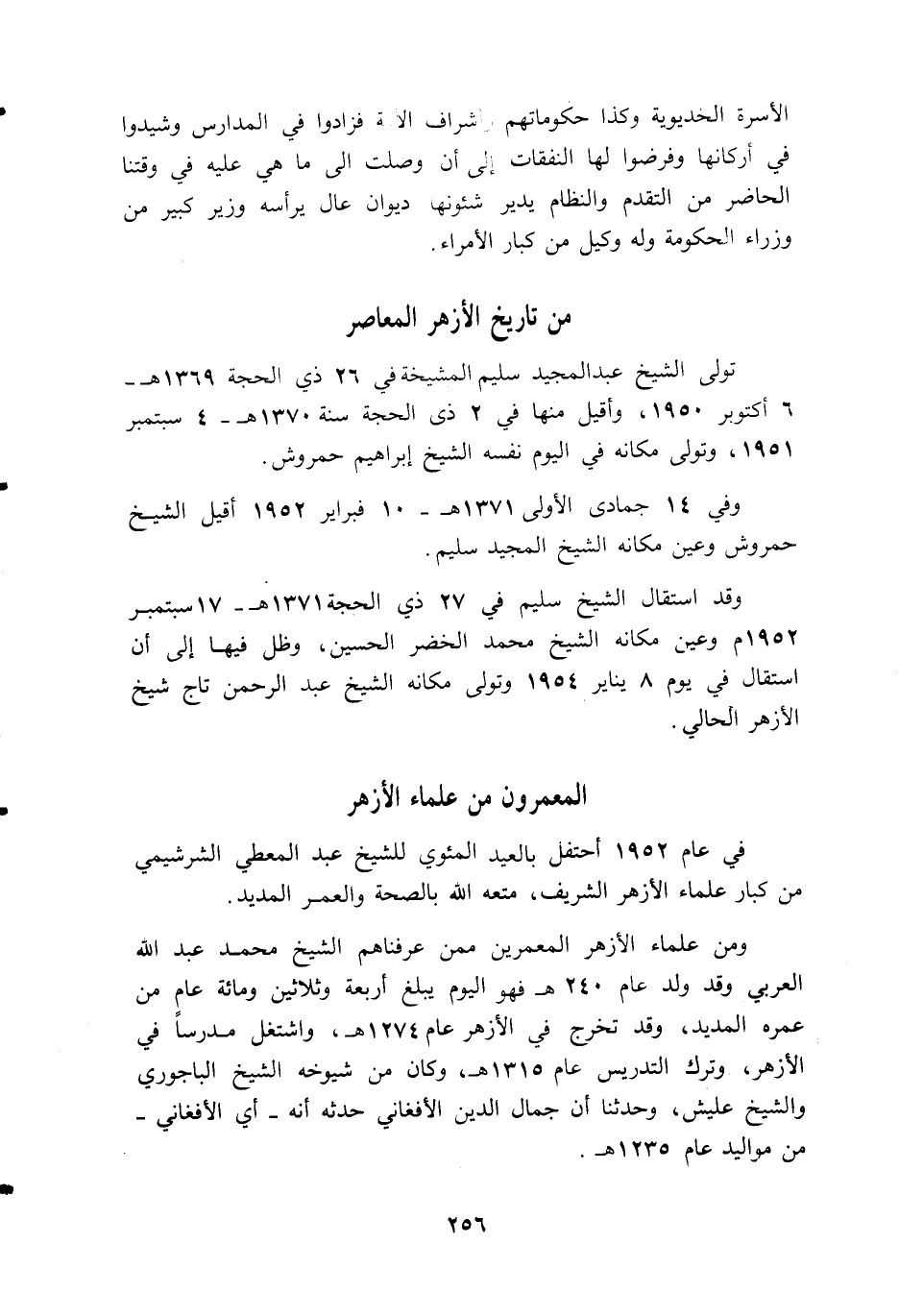ومن علماء الأزهر المعمرين ممن عرفناهم الشيخ محمد عبد اللّه العربي وقد ولد عام 240 ه فهو اليوم يبلغ أربعة وثلاثين ومائة عام من عمره المديد، وقد تخرج في الأزهر عام 1274 ه، واشتغل مدرسا في الأزهر، وترك التدريس عام 1315 ه، وكان من شيوخه الشيخ الباجوري والشيخ عليش، وحدثنا أن جمال الدين الأفغاني حدثه أنه-أي الأفغاني- من مواليد عام 1235 ه.