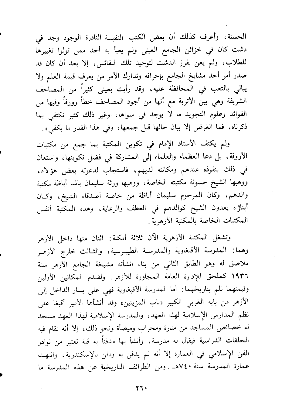 الحسنة، وأعرف كذلك أن بعض الكتب النفيسة النادرة الوجود وجد في دشت كان في خزائن الجامع العينى ولم يعبأ به أحد ممن تولوا تغييرها للطلاب، ولم يعن بفرز الدشت لتوحيد تلك النفائس، إلا بعد أن كان قد صدر أمر أحد مشايخ الجامع بإحراقه وتدارك الأمر من يعرف قيمة العلم ولا يبالي بالتعب في المحافظة عليه، وقد رأيت بعينى كثيرا من المصاحف الشريفة وهي بين الأتربة مع أنها من أجود المصاحف خطا وورقا وفيها من الفوائد وعلوم التجويد ما لا يوجد في سواها، وغير ذلك كثير نكتفي بما ذكرناه، فما الغرض إلا بيان حالها قبل جمعها، وفي هذا القدر ما يكفي».