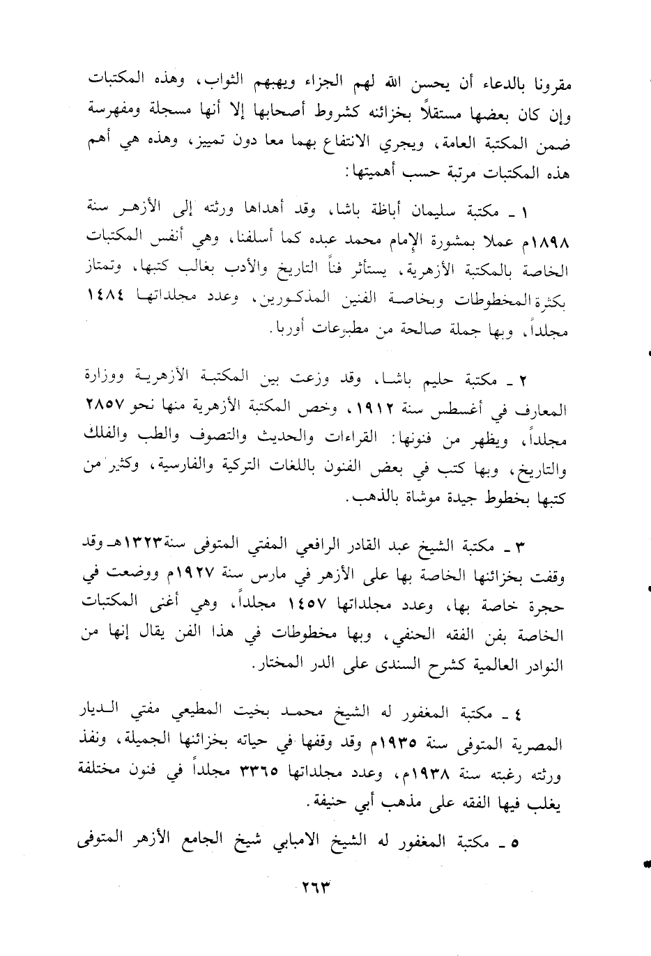 3 - مكتبة الشيخ عبد القادر الرافعي المفتي المتوفى سنة 1323 ه وقد وقفت بخزائنها الخاصة بها على الأزهر في مارس سنة 1927 م ووضعت في حجرة خاصة بها، وعدد مجلداتها 1457 مجلدا، وهي أغنى المكتبات الخاصة بفن الفقه الحنفي، وبها مخطوطات في هذا الفن يقال إنها من النوادر العالمية كشرح السندى على الدر المختار.