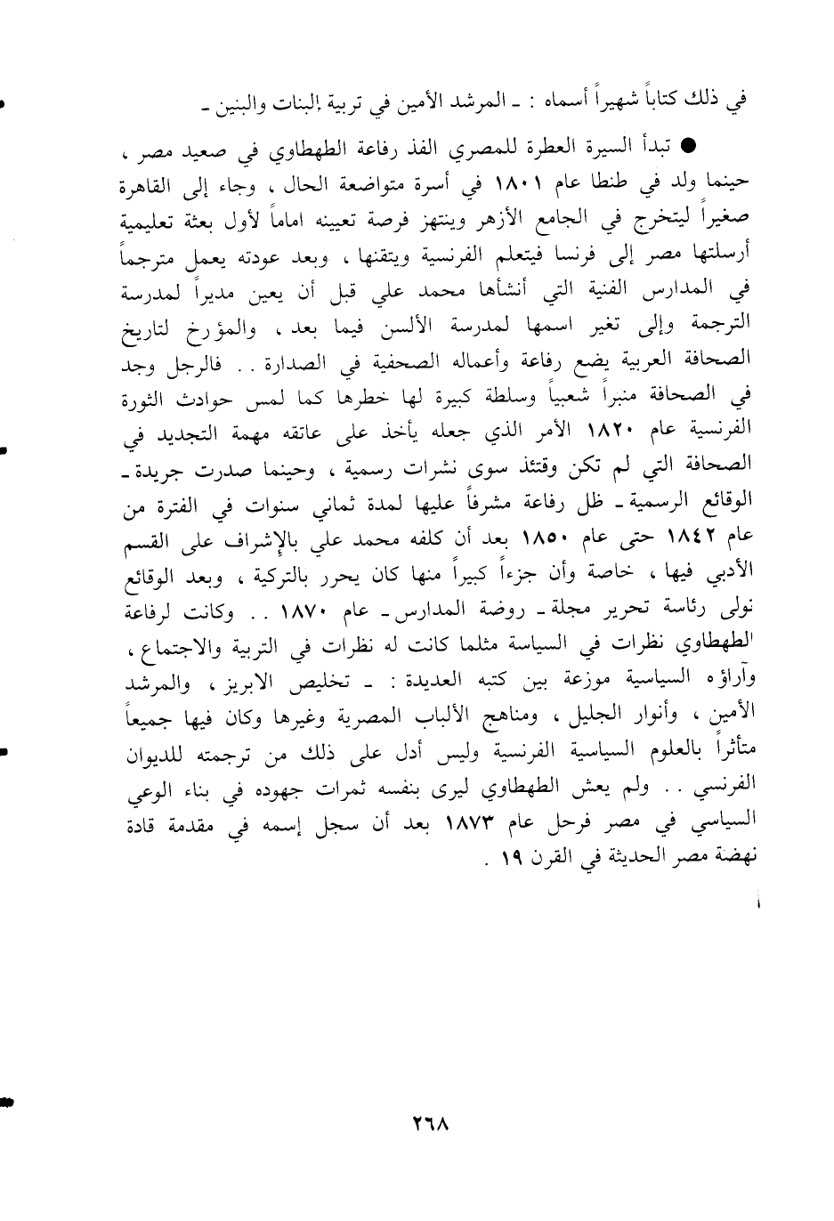تبدأ السيرة العطرة للمصري الفذ رفاعة الطهطاوي في صعيد مصر، حينما ولد في طنطا عام 1801 في أسرة متواضعة الحال، وجاء إلى القاهرة صغيرا ليتخرج في الجامع الأزهر وينتهز فرصة تعيينه اماما لأول بعثة تعليمية أرسلتها مصر إلى فرنسا فيتعلم الفرنسية ويتقنها، وبعد عودته يعمل مترجما في المدارس الفنية التي أنشأها محمد علي قبل أن يعين مديرا لمدرسة الترجمة وإلى تغير اسمها لمدرسة الألسن فيما بعد، والمؤرخ لتاريخ الصحافة العربية يضع رفاعة وأعماله الصحفية في الصدارة. . فالرجل وجد في الصحافة منبرا شعبيا وسلطة كبيرة لها خطرها كما لمس حوادث الثورة الفرنسية عام 1820 الأمر الذي جعله يأخذ على عاتقه مهمة التجديد في الصحافة التي لم تكن وقتئذ سوى نشرات رسمية، وحينما صدرت جريدة- الوقائع الرسمية-ظل رفاعة مشرفا عليها لمدة ثماني سنوات في الفترة من عام 1842 حتى عام 1850 بعد أن كلفه محمد علي بالإشراف على القسم الأدبي فيها، خاصة وأن جزءا كبيرا منها كان يحرر بالتركية، وبعد الوقائع نولى رئاسة تحرير مجلة-روضة المدارس-عام 1870. . وكانت لرفاعة الطهطاوي نظرات في السياسة مثلما كانت له نظرات في التربية والاجتماع، وآراؤه السياسية موزعة بين كتبه العديدة: -تخليص الابريز، والمرشد الأمين، وأنوار الجليل، ومناهج الألباب المصرية وغيرها وكان فيها جميعا متأثرا بالعلوم السياسية الفرنسية وليس أدل على ذلك من ترجمته للديوان الفرنسي. . ولم يعش الطهطاوي ليرى بنفسه ثمرات جهوده في بناء الوعي السياسي في مصر فرحل عام 1873 بعد أن سجل إسمه في مقدمة قادة نهضة مصر الحديثة في القرن 19.