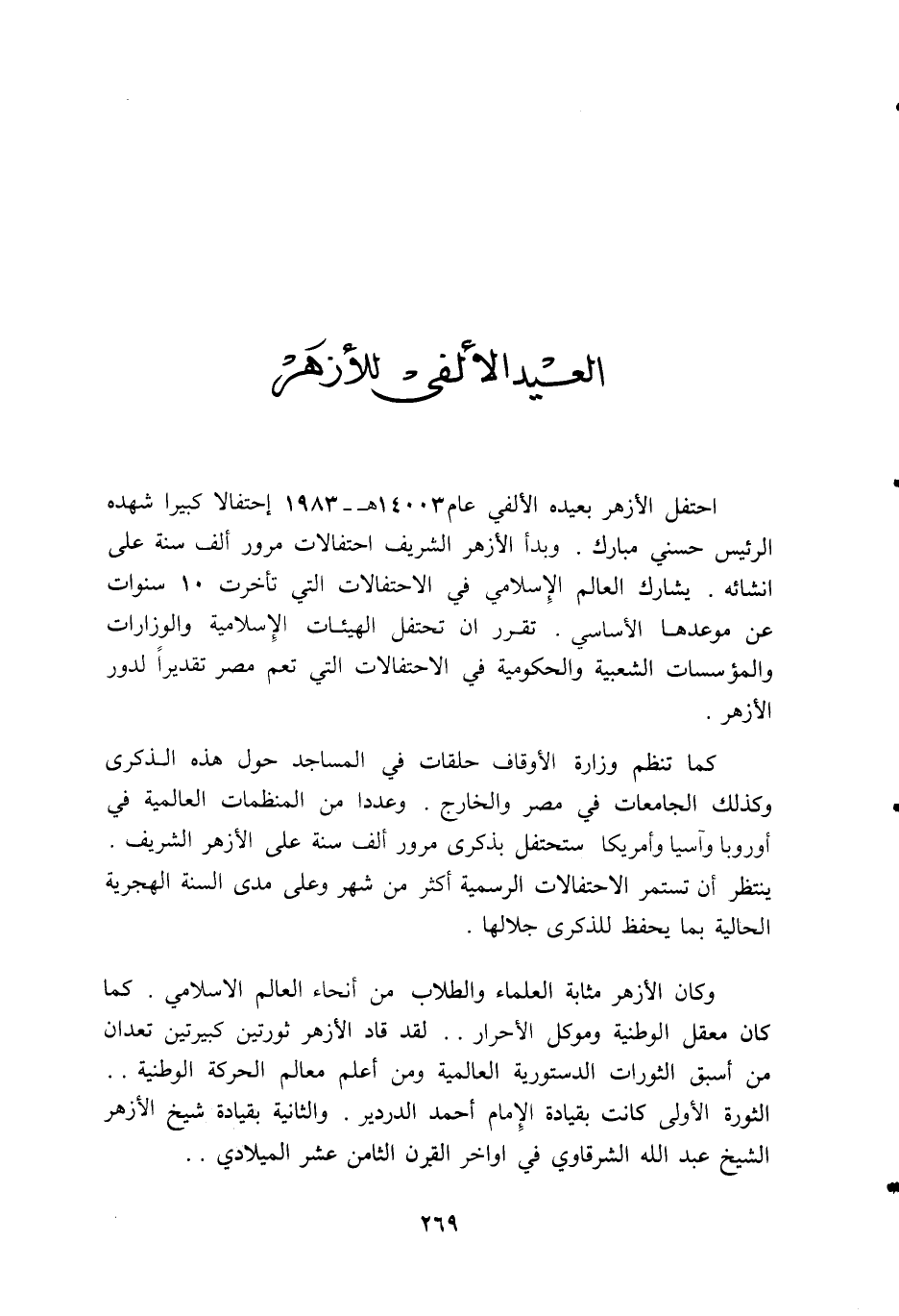 احتفل الأزهر بعيده الألفي عام 14003 ه- 1983 إحتفالا كبيرا شهده الرئيس حسني مبارك. وبدأ الأزهر الشريف احتفالات مرور ألف سنة على انشائه. يشارك العالم الإسلامي في الاحتفالات التي تأخرت 10 سنوات عن موعدها الأساسي. تقرر ان تحتفل الهيئات الإسلامية والوزارات والمؤسسات الشعبية والحكومية في الاحتفالات التي تعم مصر تقديرا لدور الأزهر.