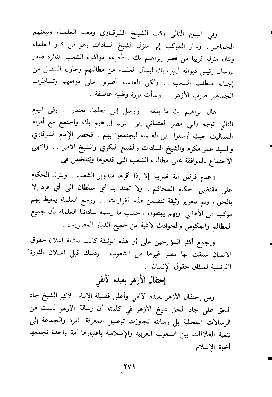 هال ابراهيم بك ما بلغه. . وأرسل إلى العلماء يعتذر. . وفي اليوم التالي توجه والي مصر العثماني إلى منزل إبراهيم بك واجتمع مع أمراء المماليك حيث أرسلوا إلى العلماء ليجتمعوا بهم. فحضر الإمام الشرقاوي والسيد عمر مكرم والشيخ السادات والشيخ البكري والشيخ الأمير. . وانتهى الاجتماع بالموافقة على مطالب الشعب التي قدموها وتتلخص في: