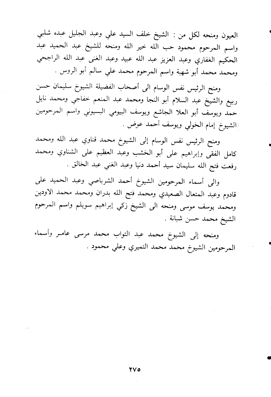 ومنح الرئيس نفس الوسام الى أصحاب الفضيلة الشيوخ سليمان حسن ربيع والشيخ عبد السلام أبو النجا ومحمد عبد المنعم خفاجي ومحمد نايل حمد ويوسف أبو العلا الجاشع ويوسف البيومي البسيوني واسم المرحومين الشيوخ إمام الخولي ويوسف أحمد عوض.