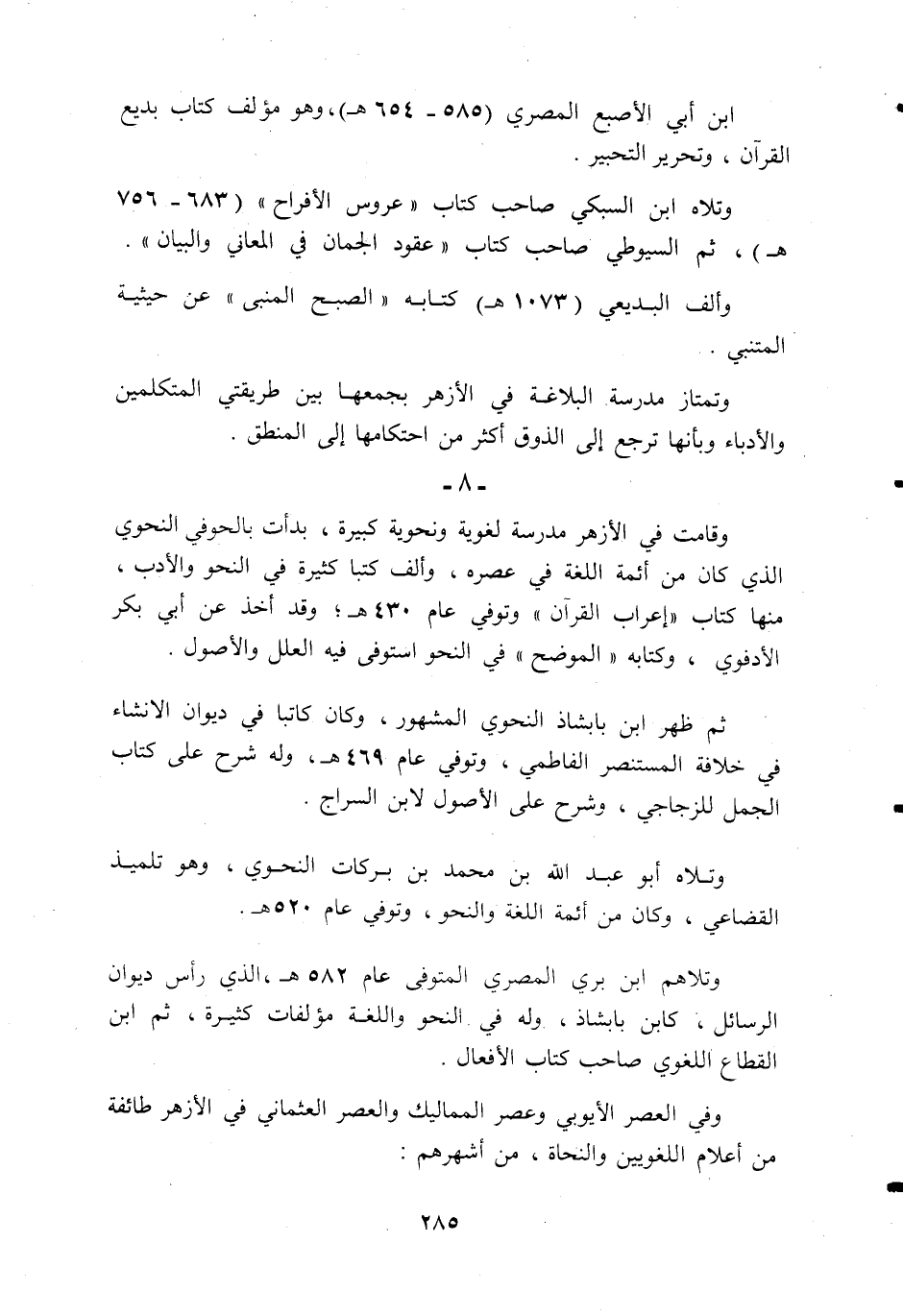 وقامت في الأزهر مدرسة لغوية ونحوية كبيرة، بدأت بالحوفي النحوي الذي كان من أئمة اللغة في عصره، وألف كتبا كثيرة في النحو والأدب، منها كتاب «إعراب القرآن» وتوفي عام 430 ه؛ وقد أخذ عن أبي بكر الأدفوي، وكتابه «الموضح» في النحو استوفى فيه العلل والأصول.