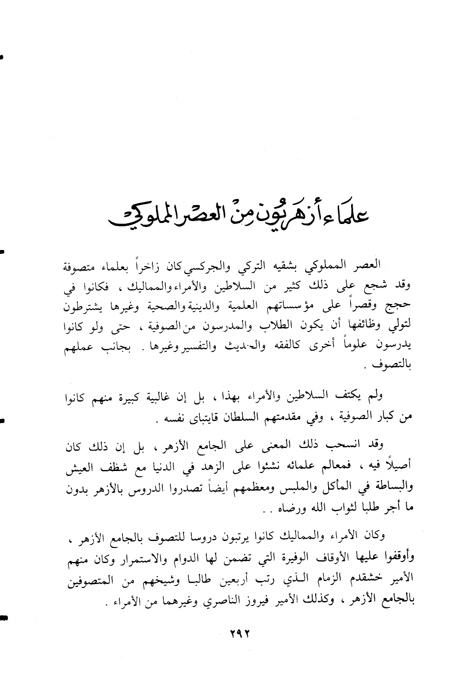 وكان الأمراء والمماليك كانوا يرتبون دروسا للتصوف بالجامع الأزهر، وأوقفوا عليها الأوقاف الوفيرة التي تضمن لها الدوام والاستمرار وكان منهم الأمير خشقدم الزمام الذي رتب أربعين طالبا وشيخهم من المتصوفين بالجامع الأزهر، وكذلك الأمير فيروز الناصري وغيرهما من الأمراء.