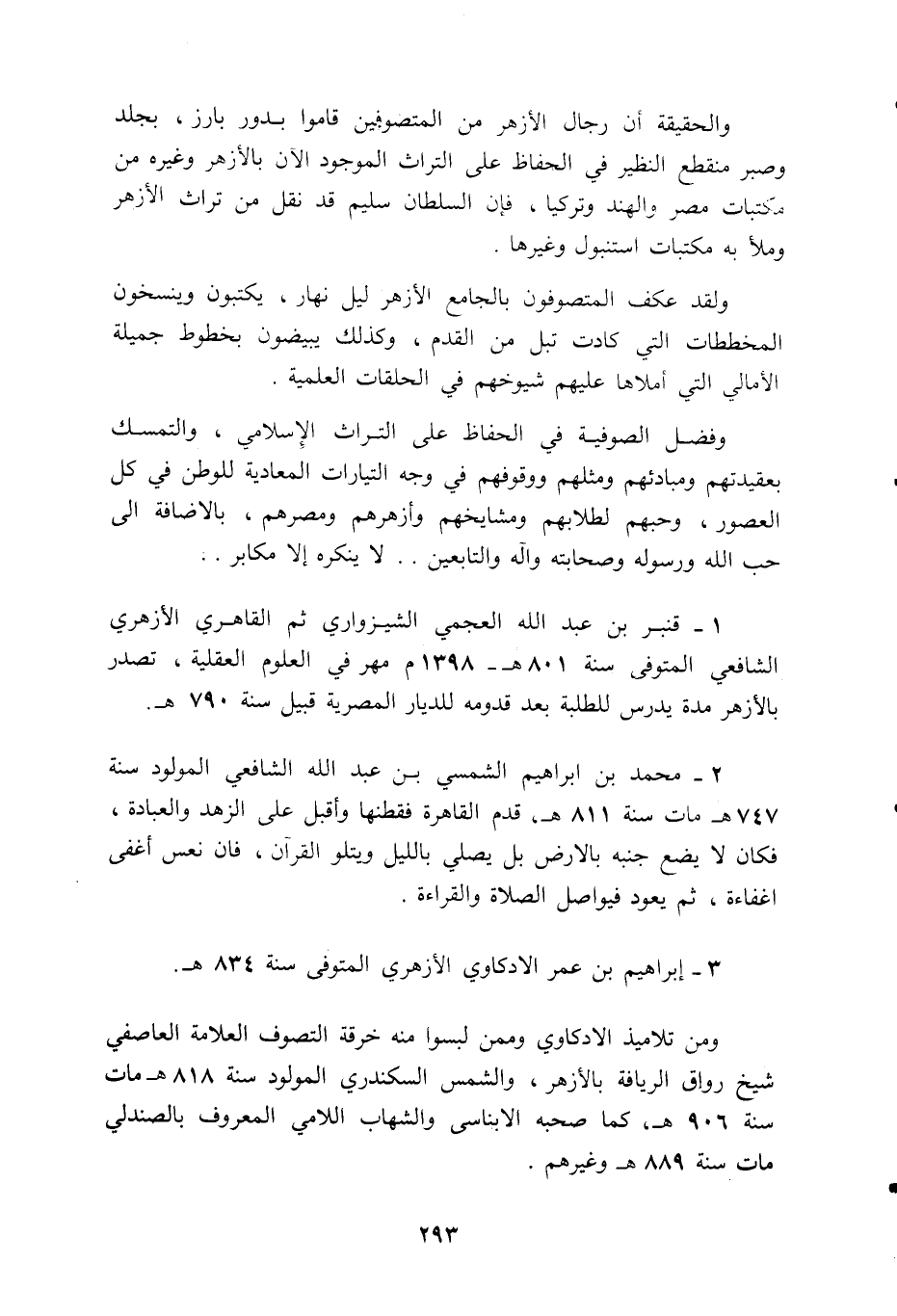 والحقيقة أن رجال الأزهر من المتصوفين قاموا بدور بارز، بجلد وصبر منقطع النظير في الحفاظ على التراث الموجود الآن بالأزهر وغيره من مكتبات مصر والهند وتركيا، فإن السلطان سليم قد نقل من تراث الأزهر وملأ به مكتبات استنبول وغيرها.