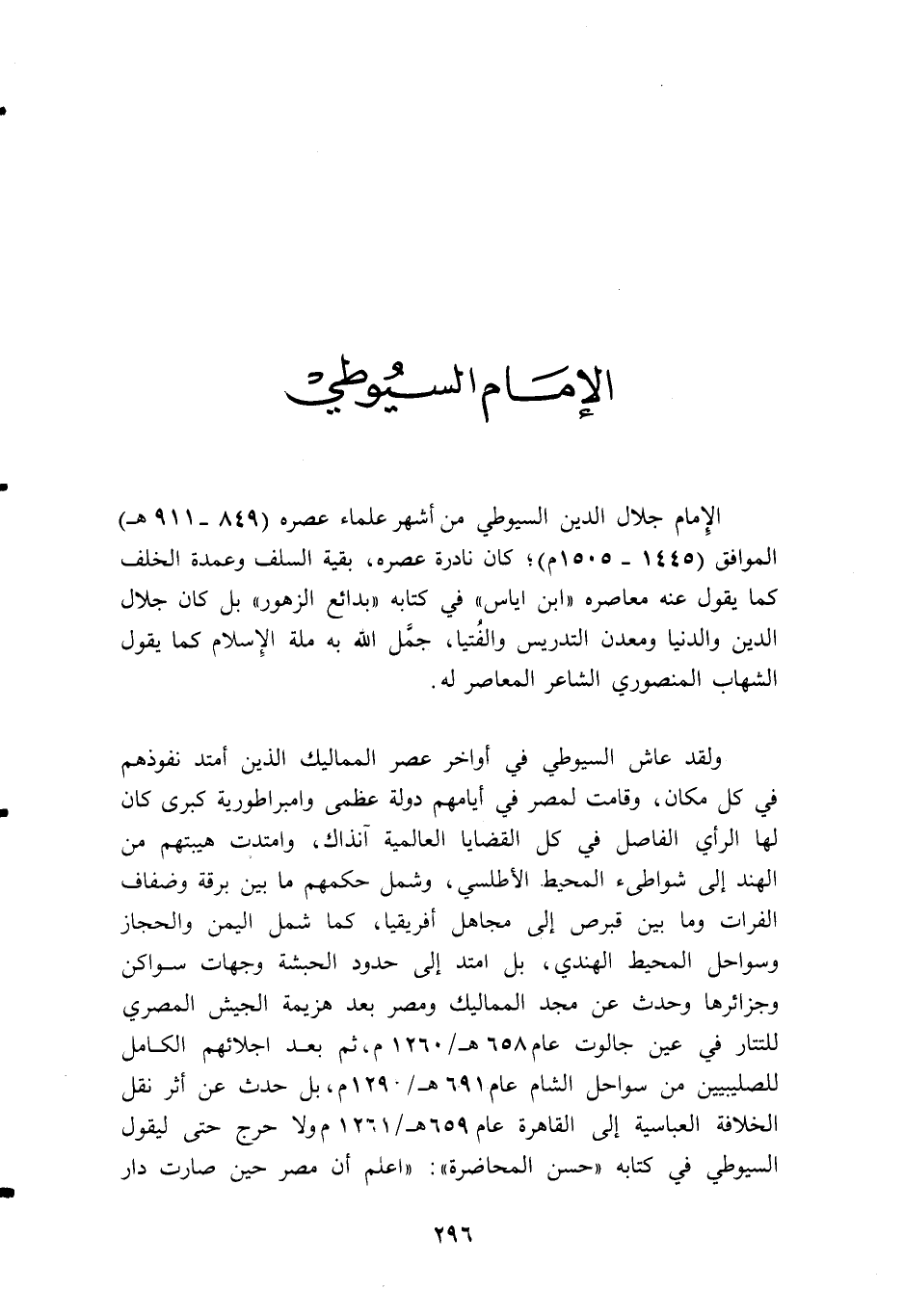 الإمام جلال الدين السيوطي من أشهر علماء عصره (849 - 911 ه) الموافق (1445 - 1505 م)؛ كان نادرة عصره، بقية السلف وعمدة الخلف كما يقول عنه معاصره «ابن اياس» في كتابه «بدائع الزهور» بل كان جلال الدين والدنيا ومعدن التدريس والفتيا، جمّل اللّه به ملة الإسلام كما يقول الشهاب المنصوري الشاعر المعاصر له.