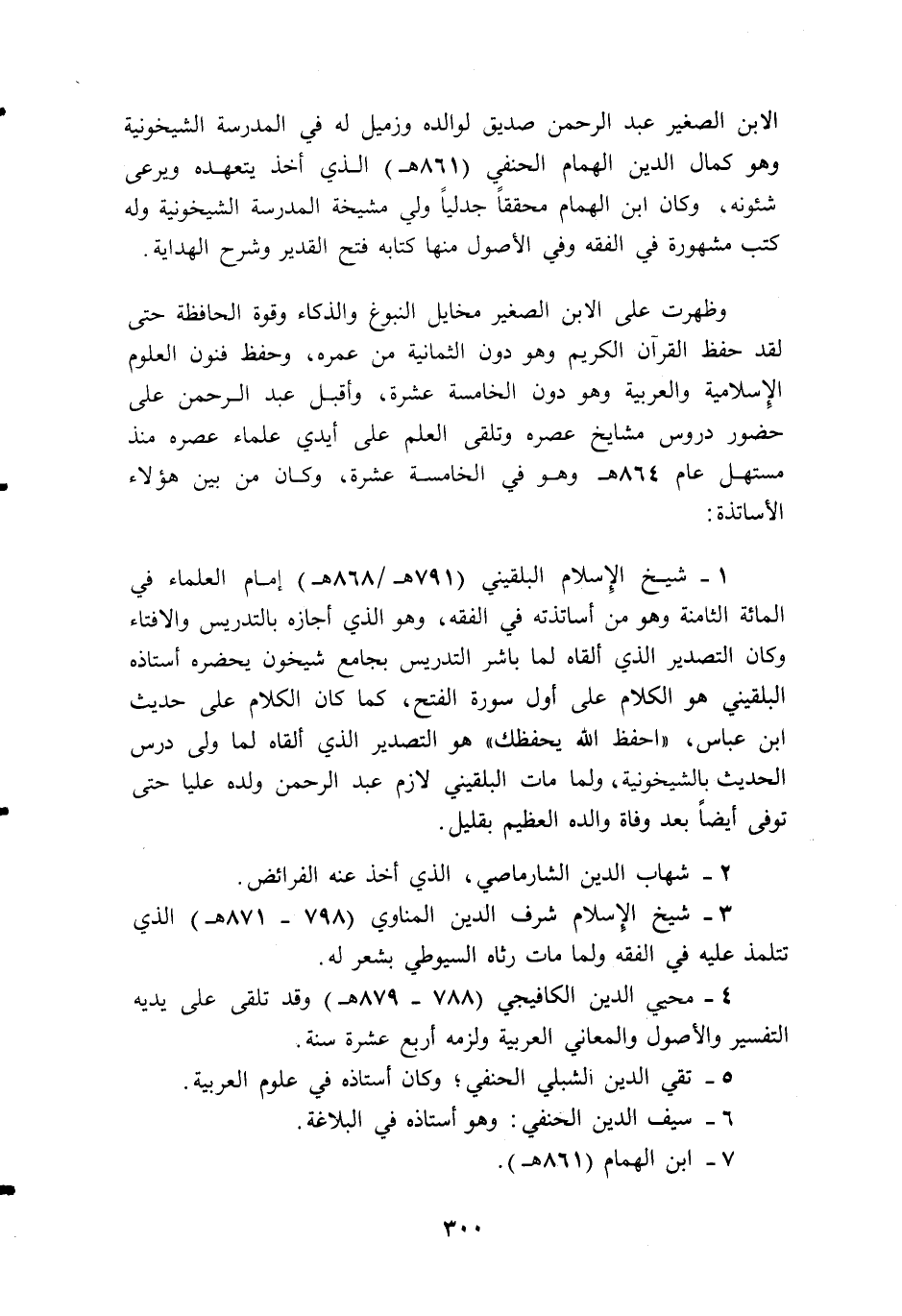 الابن الصغير عبد الرحمن صديق لوالده وزميل له في المدرسة الشيخونية وهو كمال الدين الهمام الحنفي (861 ه) الذي أخذ يتعهده ويرعى شئونه، وكان ابن الهمام محققا جدليا ولي مشيخة المدرسة الشيخونية وله كتب مشهورة في الفقه وفي الأصول منها كتابه فتح القدير وشرح الهداية.