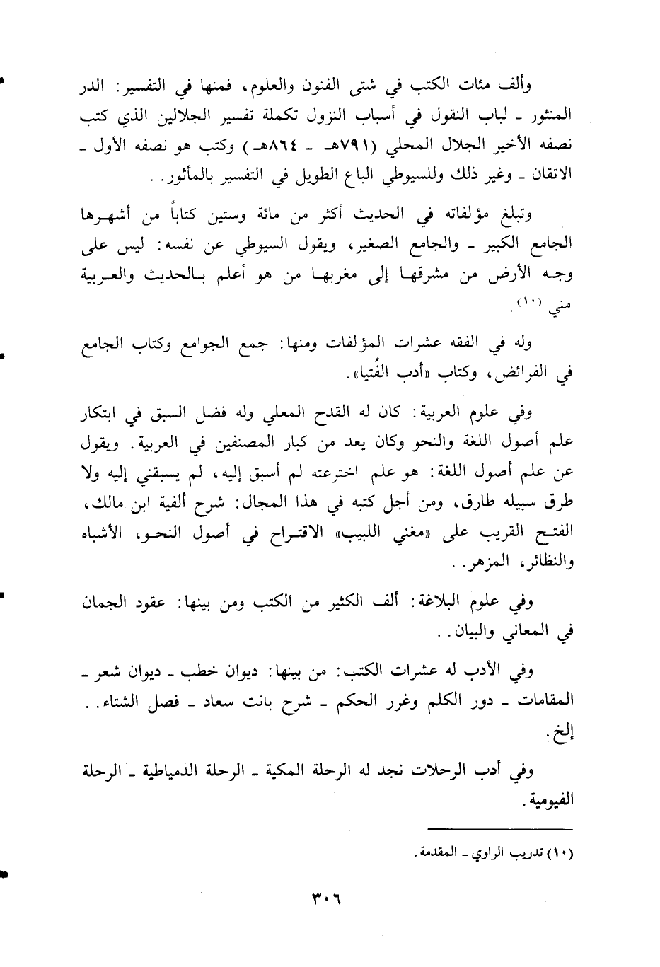 وألف مئات الكتب في شتى الفنون والعلوم، فمنها في التفسير: الدر المنثور-لباب النقول في أسباب النزول تكملة تفسير الجلالين الذي كتب نصفه الأخير الجلال المحلي (791 ه- 864 ه) وكتب هو نصفه الأول- الاتقان-و غير ذلك وللسيوطي الباع الطويل في التفسير بالمأثور. .