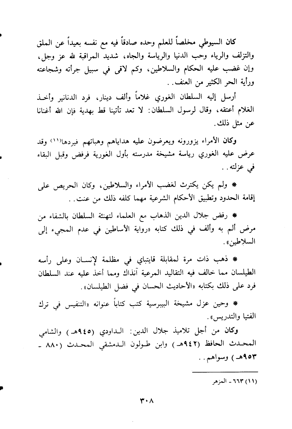 كان السيوطي مخلصا للعلم وحده صادقا فيه مع نفسه بعيدا عن الملق والتزلف والرياء وحب الدنيا والرياسة والجاه، شديد المراقبة للّه عز وجل، وإن غضب عليه الحكام والسلاطين، وكم لاقى في سبيل جرأته وشجاعته ورأية الحر الكثير من العنف. .