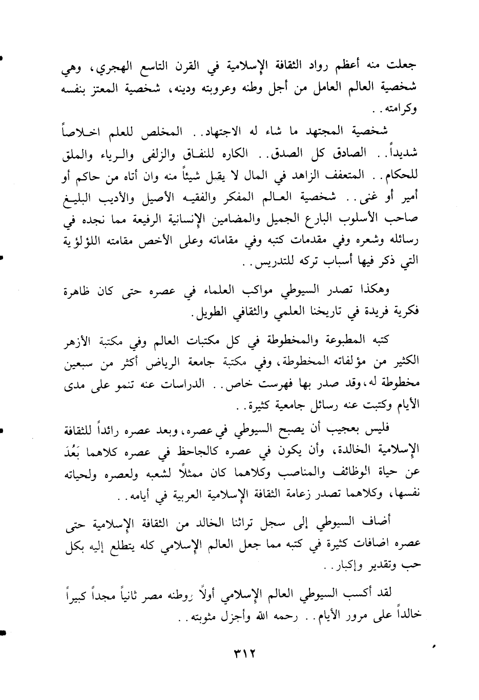لقد أكسب السيوطي العالم الإسلامي أولا ووطنه مصر ثانيا مجدا كبيرا خالدا على مرور الأيام. . رحمه اللّه وأجزل مثوبته. .