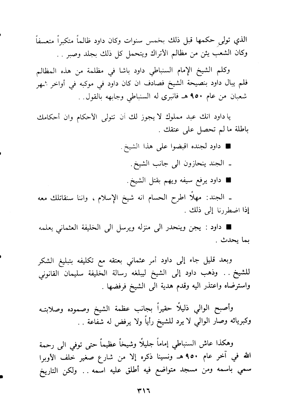 وكلم الشيخ الإمام السنباطي داود باشا في مظلمة من هذه المظالم فلم يبال داود بنصيحة الشيخ فصادف ان كان داود في موكبه في أواخر شهر شعبان من عام 950 ه فانبرى له السنباطي وجابهه بالقول. .