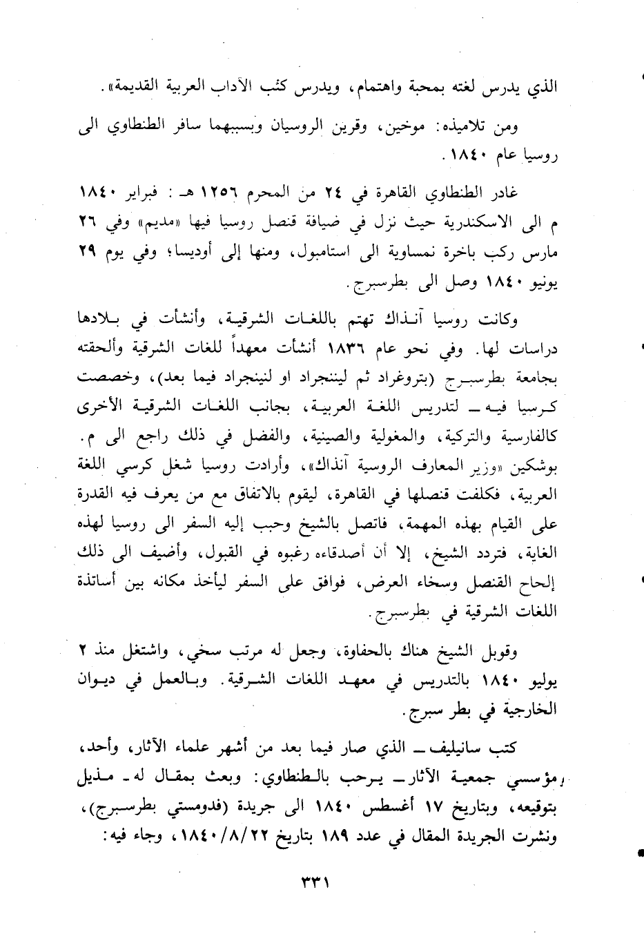 كتب سانيليف-الذي صار فيما بعد من أشهر علماء الآثار، وأحد، مؤسسي جمعية الآثار-يرحب بالطنطاوي: وبعث بمقال له-مذيل بتوقيعه، وبتاريخ 17 أغسطس 1840 الى جريدة (فدومستي بطرسبرج)، ونشرت الجريدة المقال في عدد 189 بتاريخ 22/ 8 / 1840، وجاء فيه: