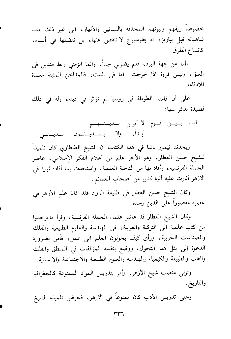 ويحدثنا تيمور باشا في هذا الكتاب ان الشيخ الطنطاوي كان تلميذا للشيخ حسن العطار، وهو الآخر علم من أعلام الفكر الإسلامي، عاصر الحملة الفرنسية، وأفاد بها من الناحية العلمية، واستحدث بما أفاده ثورة في الأزهر أثارت عليه أثرة كثير من أصحاب العمائم.