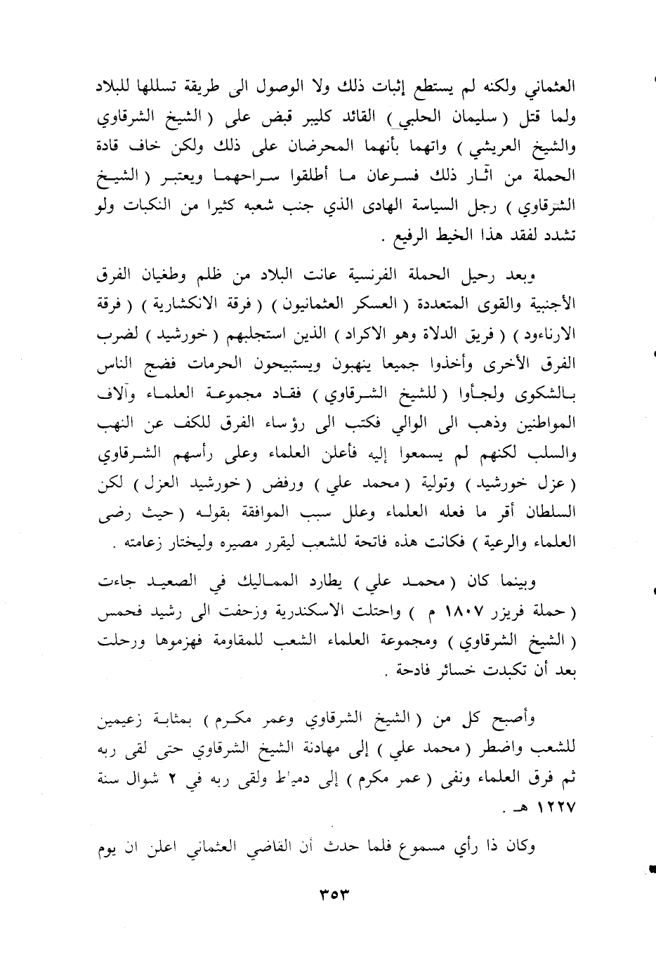 العثماني ولكنه لم يستطع إثبات ذلك ولا الوصول الى طريقة تسللها للبلاد ولما قتل (سليمان الحلبي) القائد كليبر قبض على (الشيخ الشرقاوي والشيخ العريشي) واتهما بأنهما المحرضان على ذلك ولكن خاف قادة الحملة من آثار ذلك فسرعان ما أطلقوا سراحهما ويعتبر (الشيخ الشرقاوي) رجل السياسة الهادى الذي جنب شعبه كثيرا من النكبات ولو تشدد لفقد هذا الخيط الرفيع.