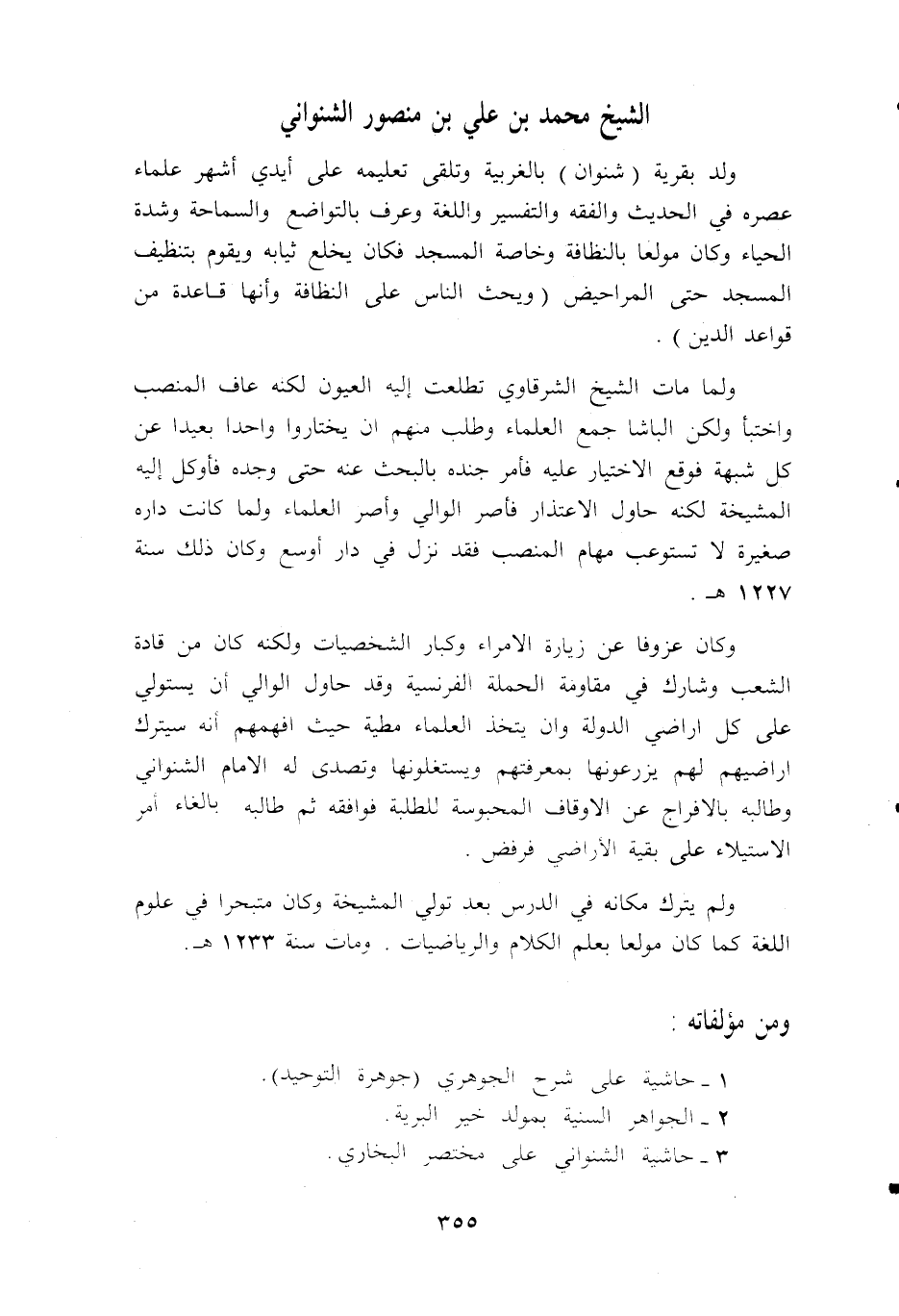 ولم يترك مكانه في الدرس بعد تولي المشيخة وكان متبحرا في علوم اللغة كما كان مولعا بعلم الكلام والرياضيات. ومات سنة 1233 ه.