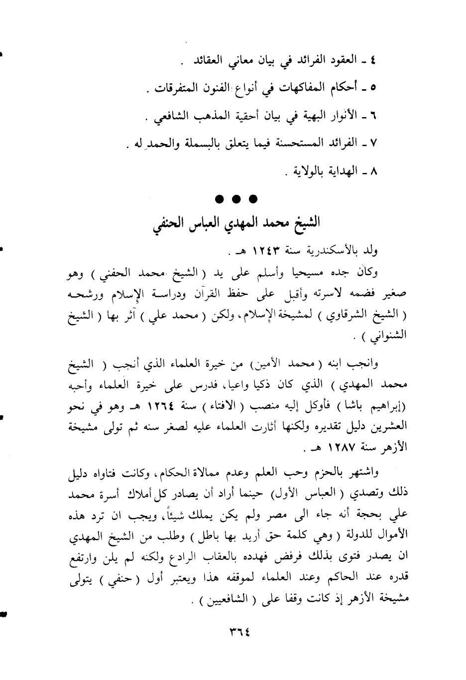 وانجب ابنه (محمد الأمين) من خيرة العلماء الذي أنجب (الشيخ محمد المهدي) الذي كان ذكيا واعيا، فدرس على خيرة العلماء وأحبه (إبراهيم باشا) فأوكل إليه منصب (الافتاء) سنة 1264 ه وهو في نحو العشرين دليل تقديره ولكنها أثارت العلماء عليه لصغر سنه ثم تولى مشيخة الأزهر سنة 1287 ه.