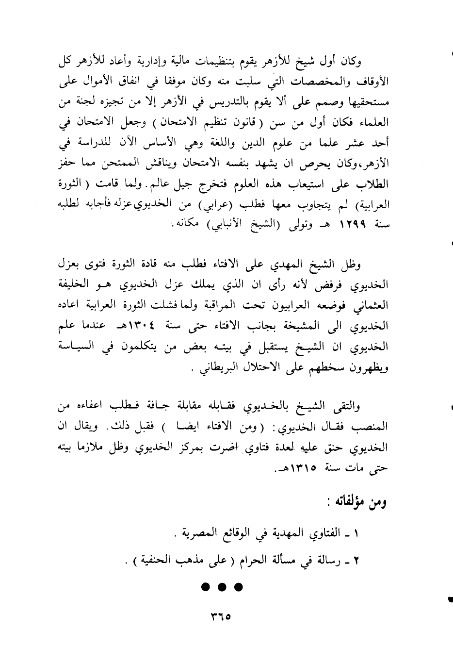 وظل الشيخ المهدي على الافتاء فطلب منه قادة الثورة فتوى بعزل الخديوي فرفض لأنه رأى ان الذي يملك عزل الخديوي هو الخليفة العثماني فوضعه العرابيون تحت المراقبة ولما فشلت الثورة العرابية اعاده الخديوي الى المشيخة بجانب الافتاء حتى سنة 1304 ه عند ما علم الخديوي ان الشيخ يستقبل في بيته بعض من يتكلمون في السياسة ويظهرون سخطهم على الاحتلال البريطاني.