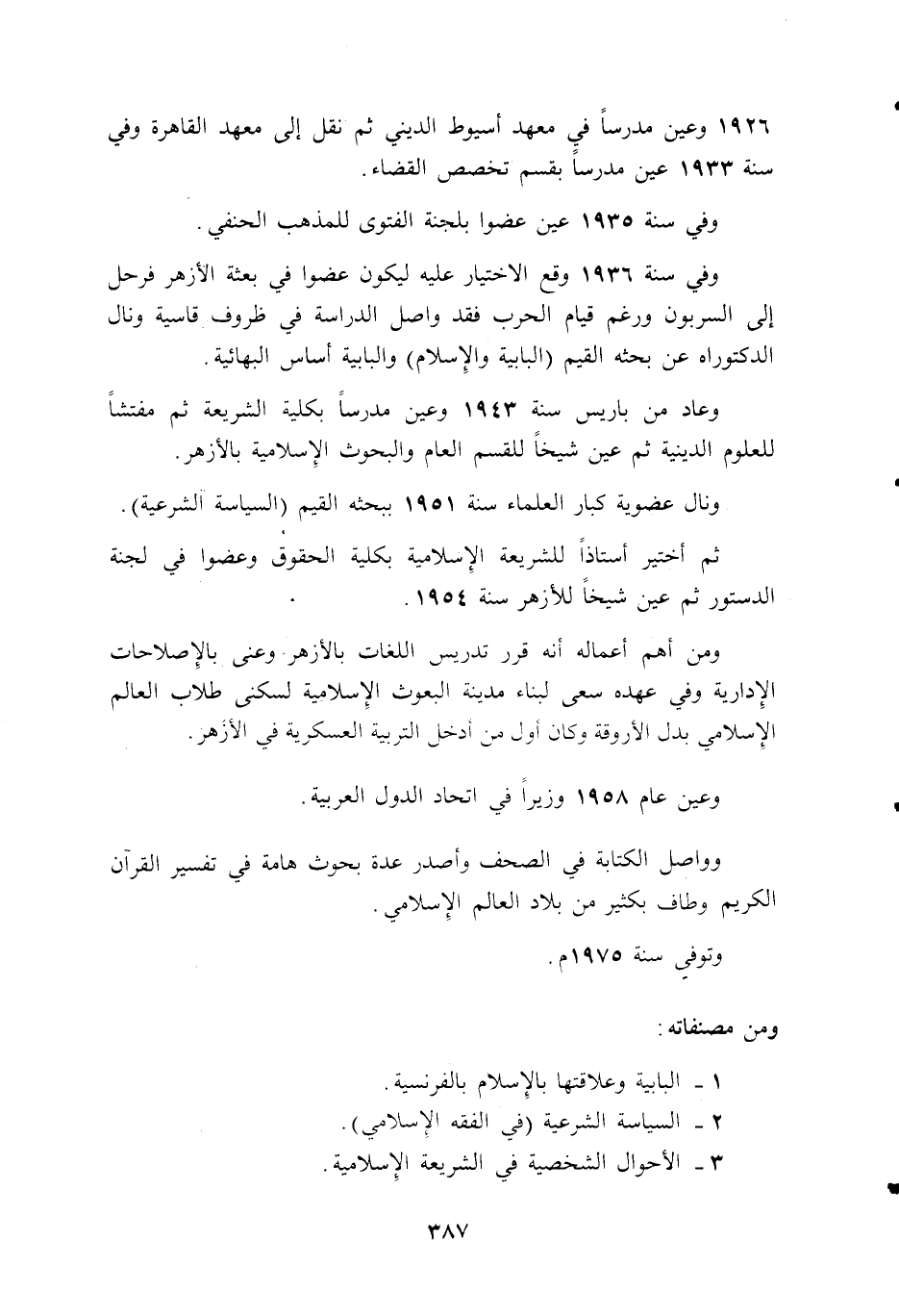 وعاد من باريس سنة 1943 وعين مدرسا بكلية الشريعة ثم مفتشا للعلوم الدينية ثم عين شيخا للقسم العام والبحوث الإسلامية بالأزهر.
