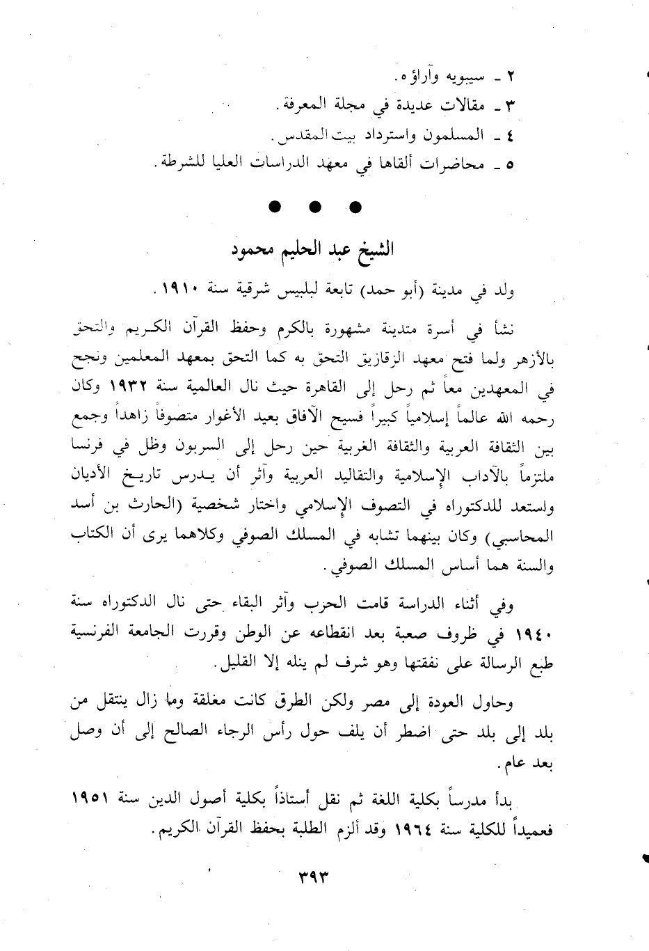 نشأ في أسرة متدينة مشهورة بالكرم وحفظ القرآن الكريم والتحق بالأزهر ولما فتح معهد الزقازيق التحق به كما التحق بمعهد المعلمين ونجح في المعهدين معا ثم رحل إلى القاهرة حيث نال العالمية سنة 1932 وكان رحمه اللّه عالما إسلاميا كبيرا فسيح الآفاق بعيد الأغوار متصوفا زاهدا وجمع بين الثقافة العربية والثقافة الغربية حين رحل إلى السربون وظل في فرنسا ملتزما بالآداب الإسلامية والتقاليد العربية وآثر أن يدرس تاريخ الأديان واستعد للدكتوراه في التصوف الإسلامي واختار شخصية (الحارث بن أسد المحاسبي) وكان بينهما تشابه في المسلك الصوفي وكلاهما يرى أن الكتاب والسنة هما أساس المسلك الصوفي.