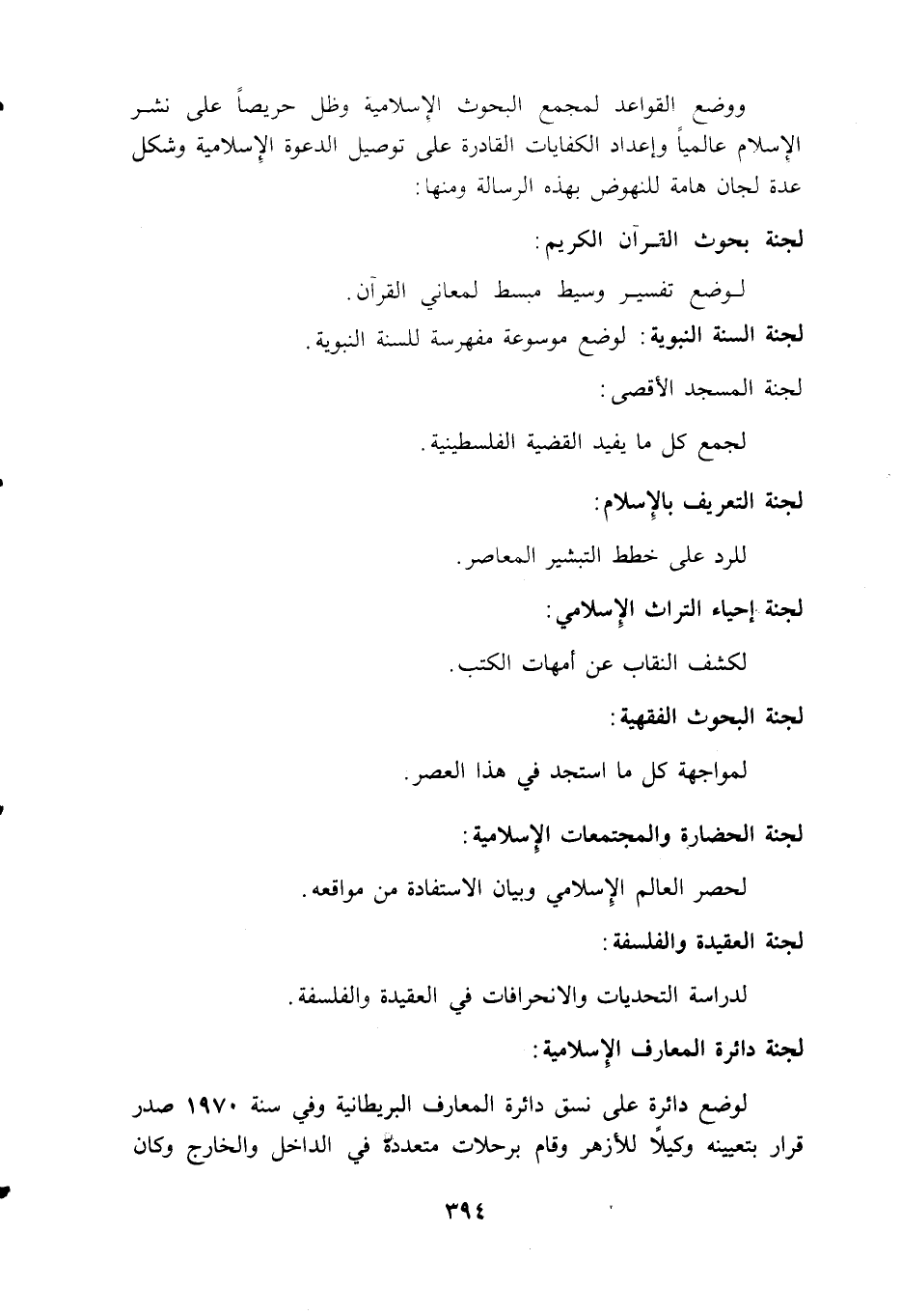 ووضع القواعد لمجمع البحوث الإسلامية وظل حريصا على نشر الإسلام عالميا وإعداد الكفايات القادرة على توصيل الدعوة الإسلامية وشكل عدة لجان هامة للنهوض بهذه الرسالة ومنها: