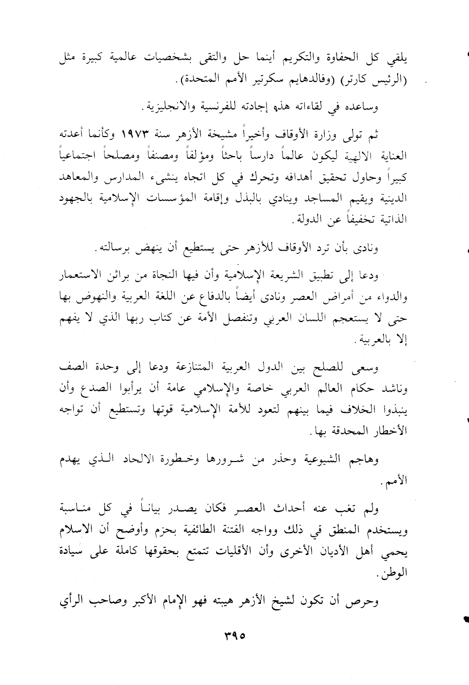 ثم تولى وزارة الأوقاف وأخيرا مشيخة الأزهر سنة 1973 وكأنما أعدته العناية الالهية ليكون عالما دارسا باحثا ومؤلفا ومصنفا ومصلحا اجتماعيا كبيرا وحاول تحقيق أهدافه وتحرك في كل اتجاه ينشىء المدارس والمعاهد الدينية ويقيم المساجد وينادي بالبذل وإقامة المؤسسات الإسلامية بالجهود الذاتية تخفيفا عن الدولة.