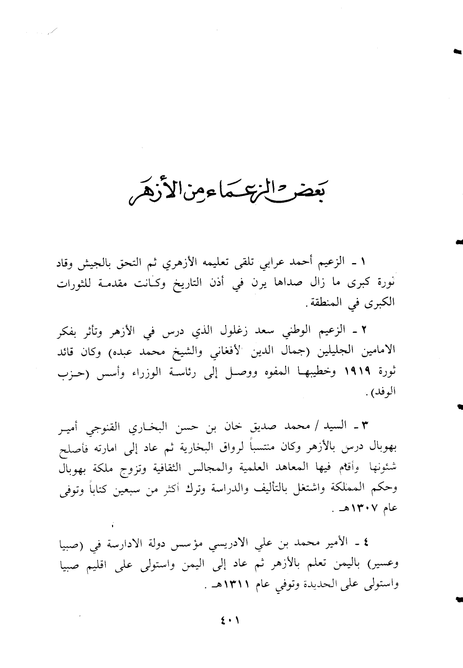 2 - الزعيم الوطني سعد زغلول الذي درس في الأزهر وتأثر بفكر الامامين الجليلين (جمال الدين لأفغاني والشيخ محمد عبده) وكان قائد ثورة 1919 وخطيبها المفوه ووصل إلى رئاسة الوزراء وأسس (حزب الوفد).